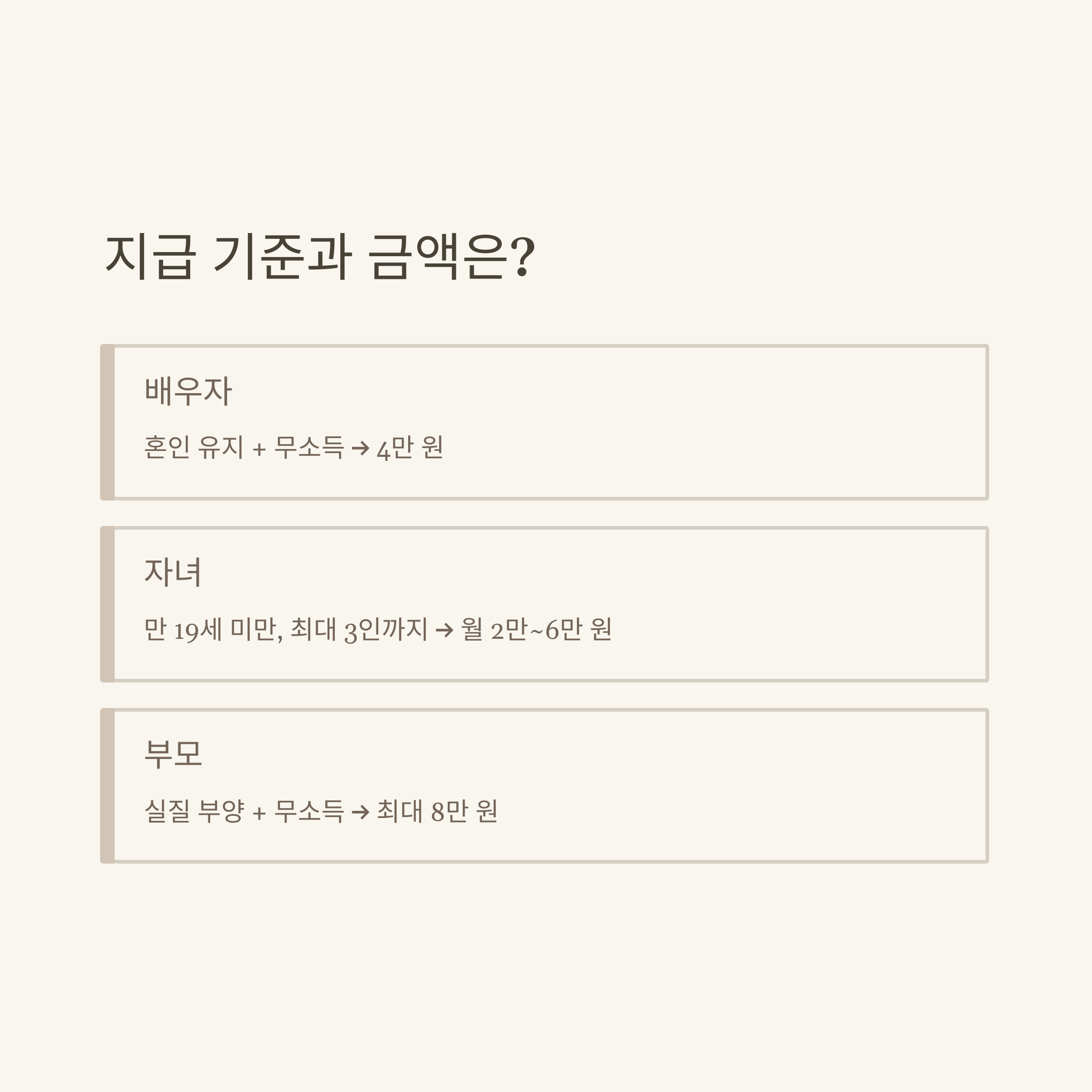- 지급 대상: 배우자, 자녀(만 19세 미만), 부모(직계존속) 등