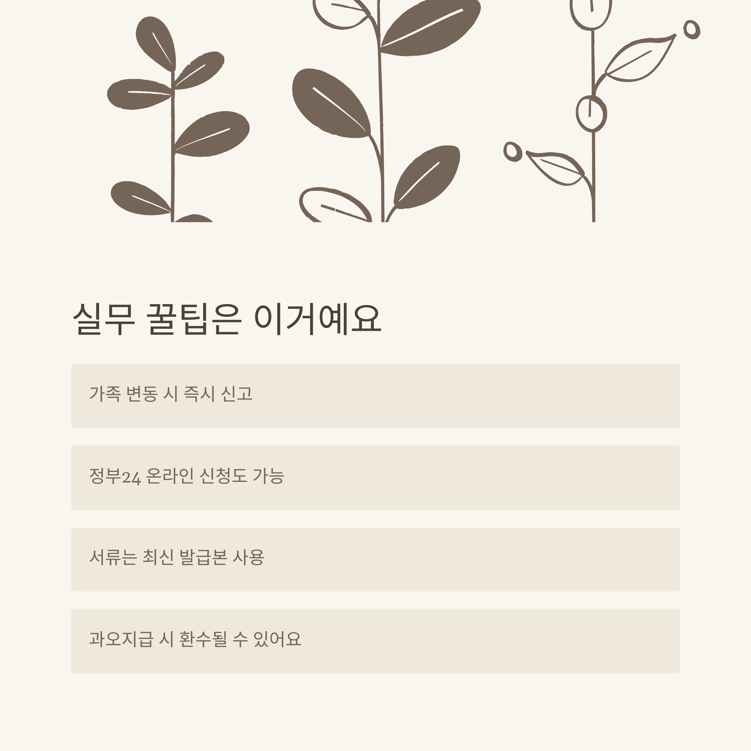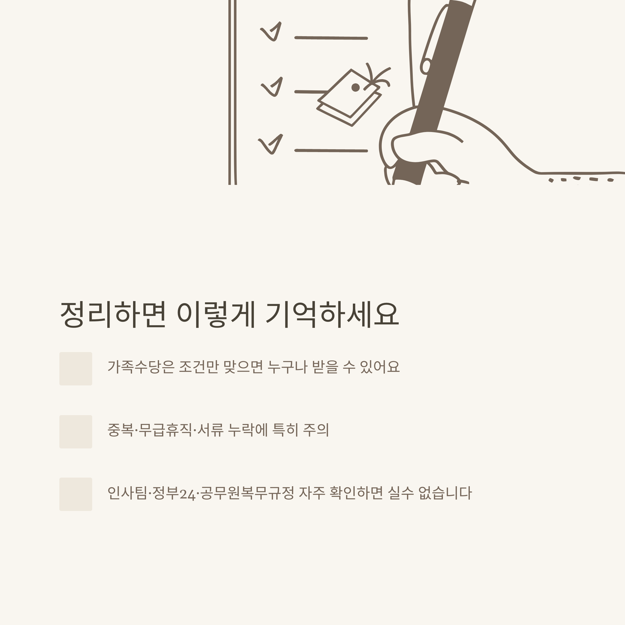 - 가족수당은 가족 상황 변동 시 신속히 신고해야 불이익이 없습니다.