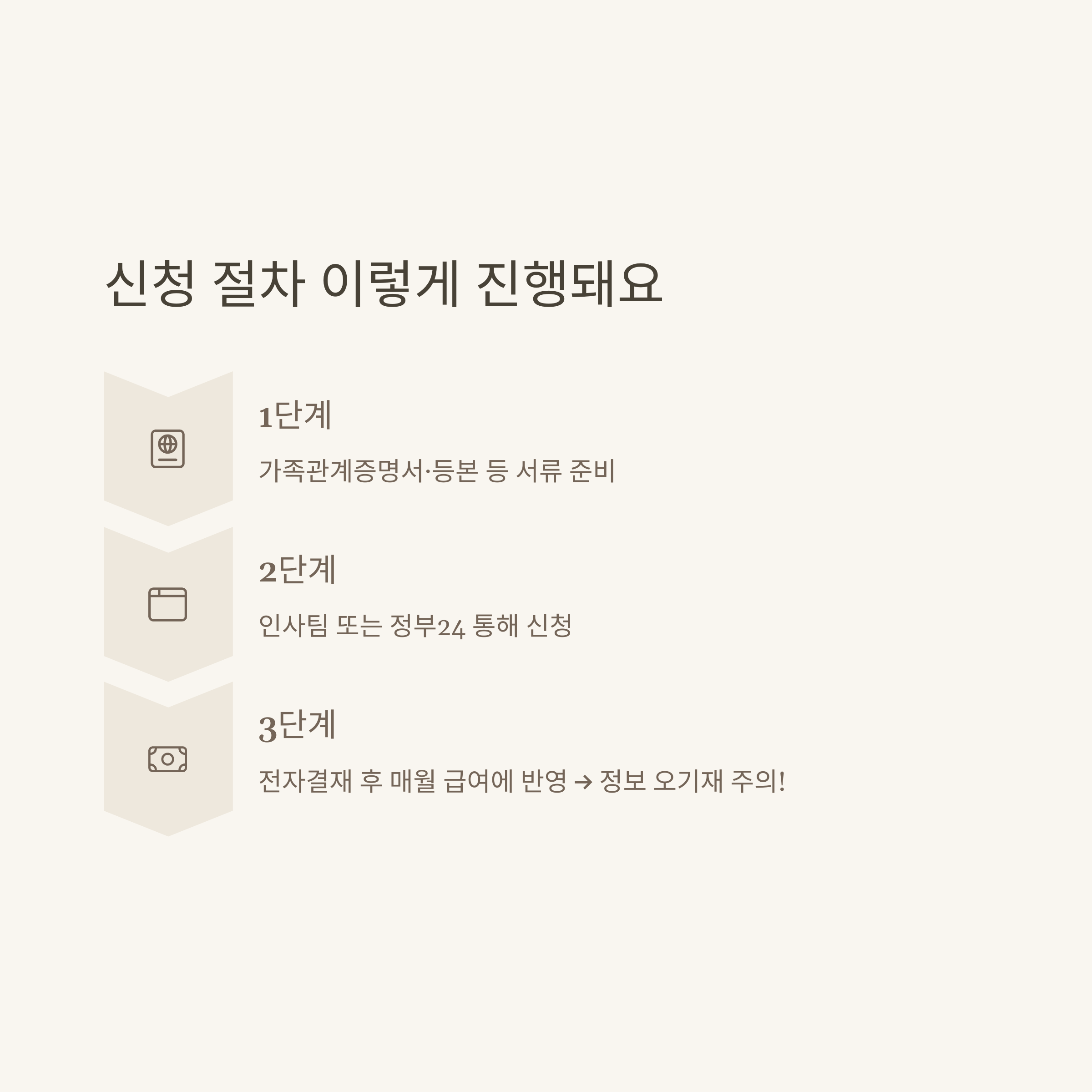 공무원 가족수당 신청은 생각보다 간단하면서도, 꼼꼼히 준비하지 않으면 서류 누락으로 번거로워질 수 있습니다. 저는 임용 첫 해에 가족수당을 신청하면서, 한 번 서류가 빠져 반려된 기억이 있습니다. 특히 주소지가 다르거나, 가족관계증명서에 정보가 누락된 경우가 많으니, 꼭 최신 서류를 준비해야 합니다. 일반적으로 신청 절차는 아래와 같습니다.