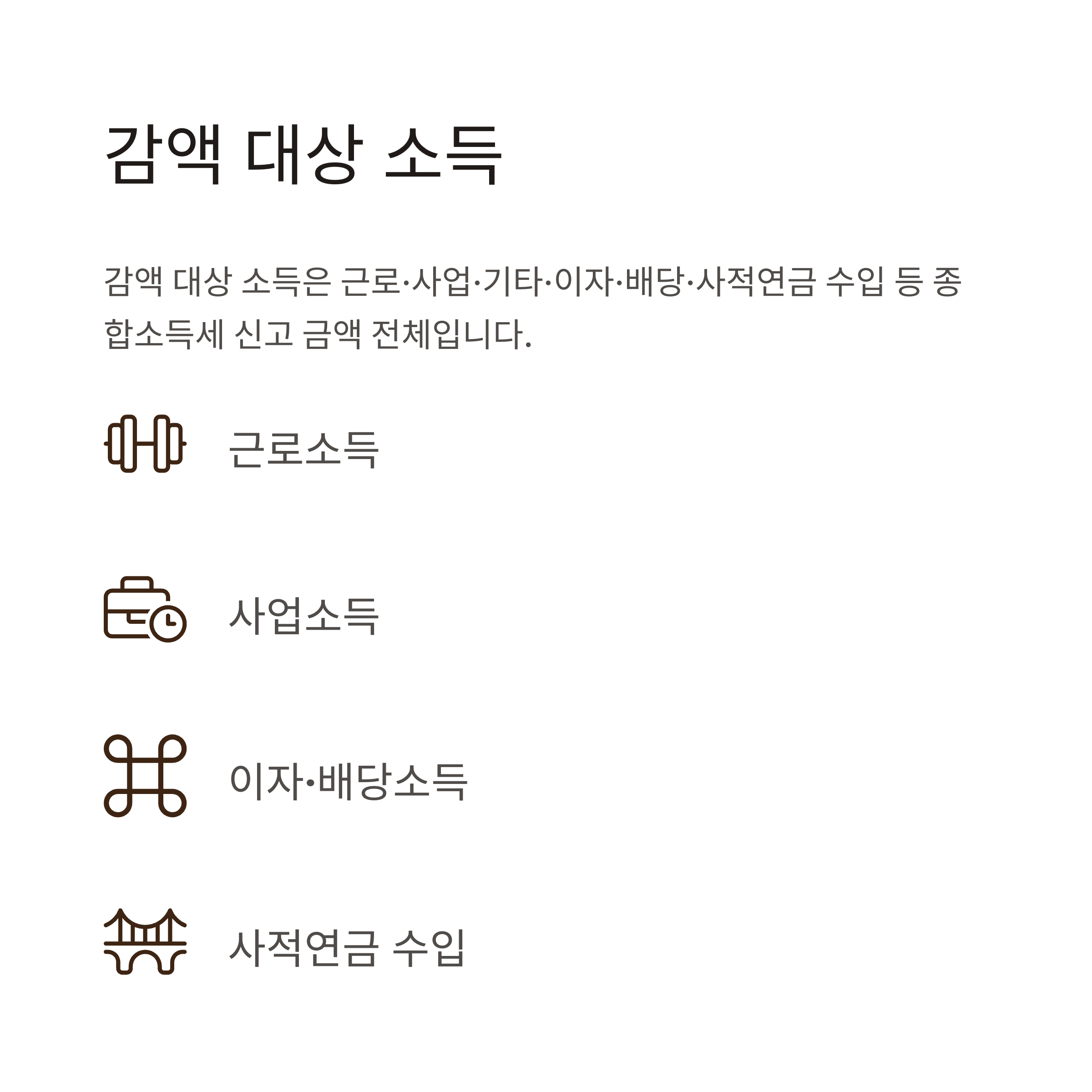 | 적용 소득 | 근로, 사업, 기타, 이자, 배당 등 |