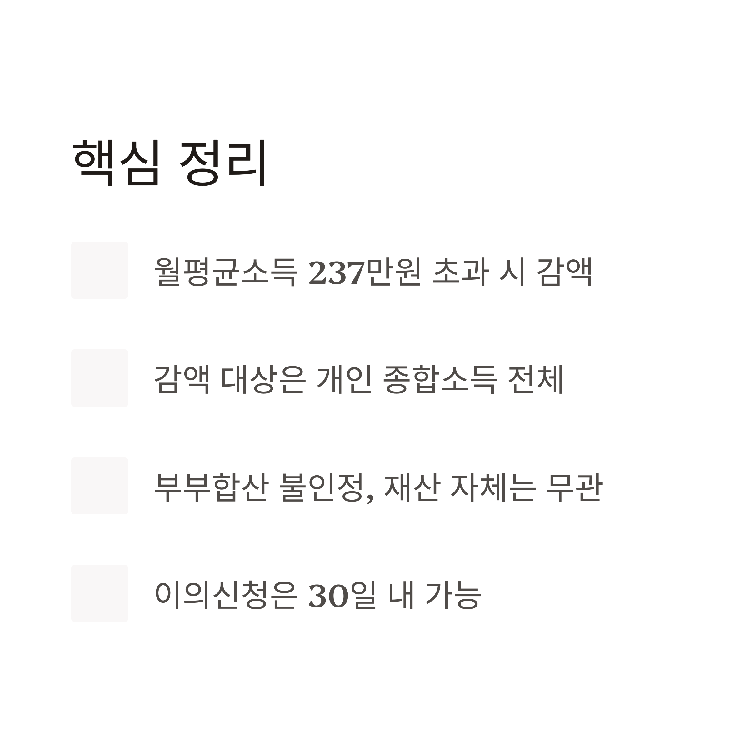 단, 부동산에서 발생하는 임대소득, 매매차익 등이 '소득'으로 신고된다면 그건 감액 기준에 들어갑니다. 즉, '재산 자체'는 문제가 없지만, '재산에서 파생된 소득'은 감액 판단의 기준이 될 수 있다는 점 기억해주세요.