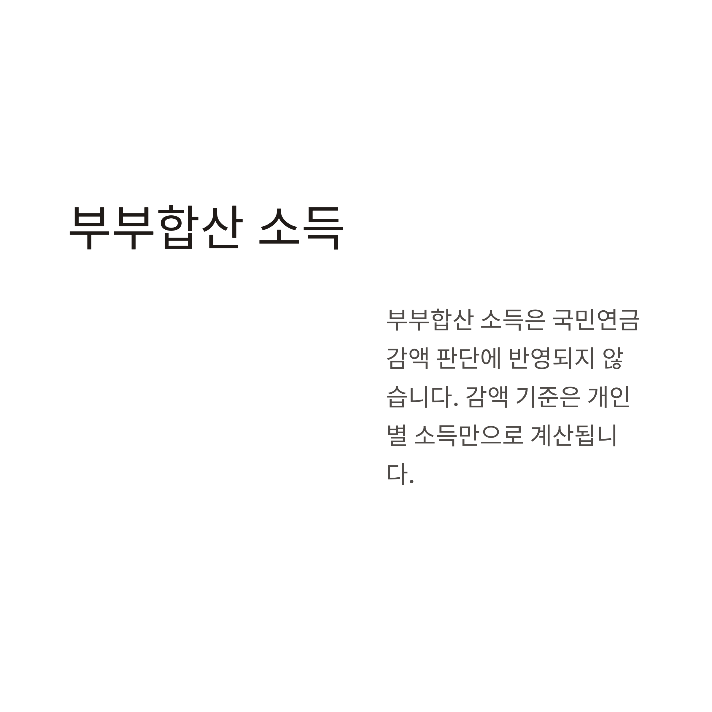 하지만, 세대 기준으로 건강보험료 부과나 노인복지 혜택에서는 부부합산을 고려하는 경우가 있기 때문에 혼동할 수 있어요. 국민연금 감액기준에서는 본인의 소득만 기준입니다.