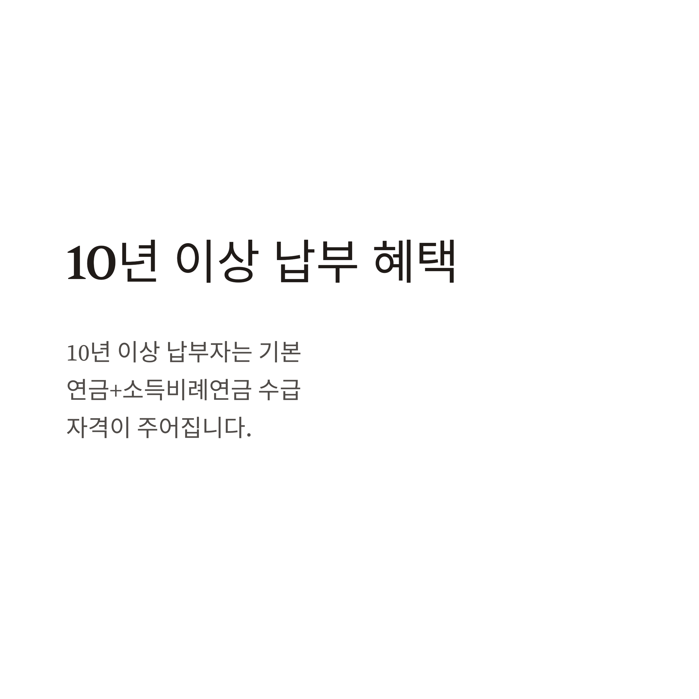 예를 들어, 10년만 납부한 경우 최소수급 기준을 충족하므로 연금은 받지만 금액은 매우 적습니다. 반면, 20년 이상 납부자는 기본 연금 외에도 소득비례 연금이 크게 증가해 매월 안정적인 수입을 기대할 수 있습니다.