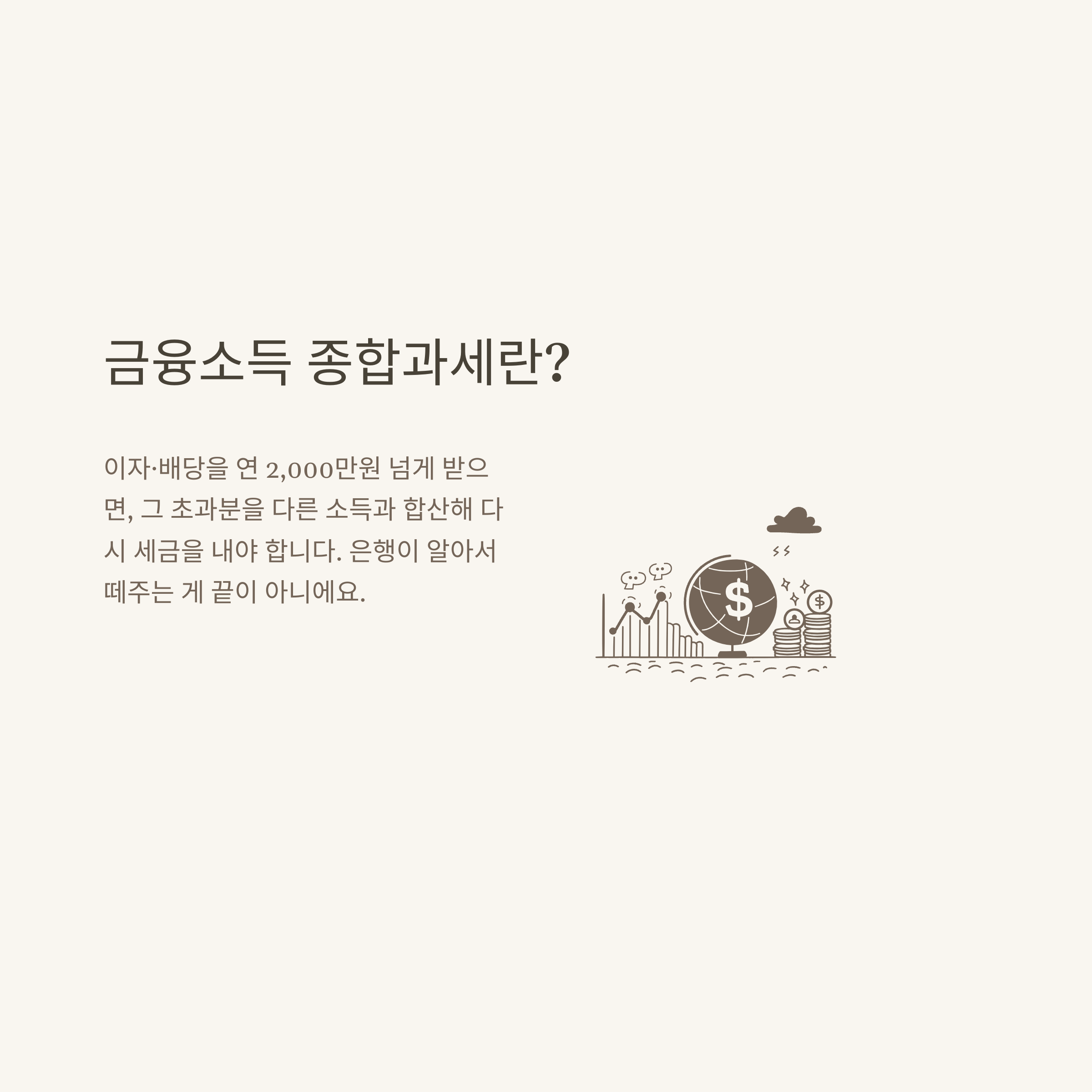 저는 처음에는 금융소득 종합과세가 누구에게 해당되는지, 도대체 어떤 의미인지도 잘 몰랐습니다. 실제로 금융소득 종합과세란 예금, 적금, 펀드, 주식 배당, 채권 이자 등 각종 금융기관에서 발생하는 모든 금융소득을 한 해에 합산해 일정 기준을 초과하면 그 초과분에 대해 종합소득세를 추가로 내야 하는 제도입니다. 평소엔 신경을 잘 안 쓰다가, 갑자기 통지서를 받고 허둥지둥하게 되는 경우도 많습니다.