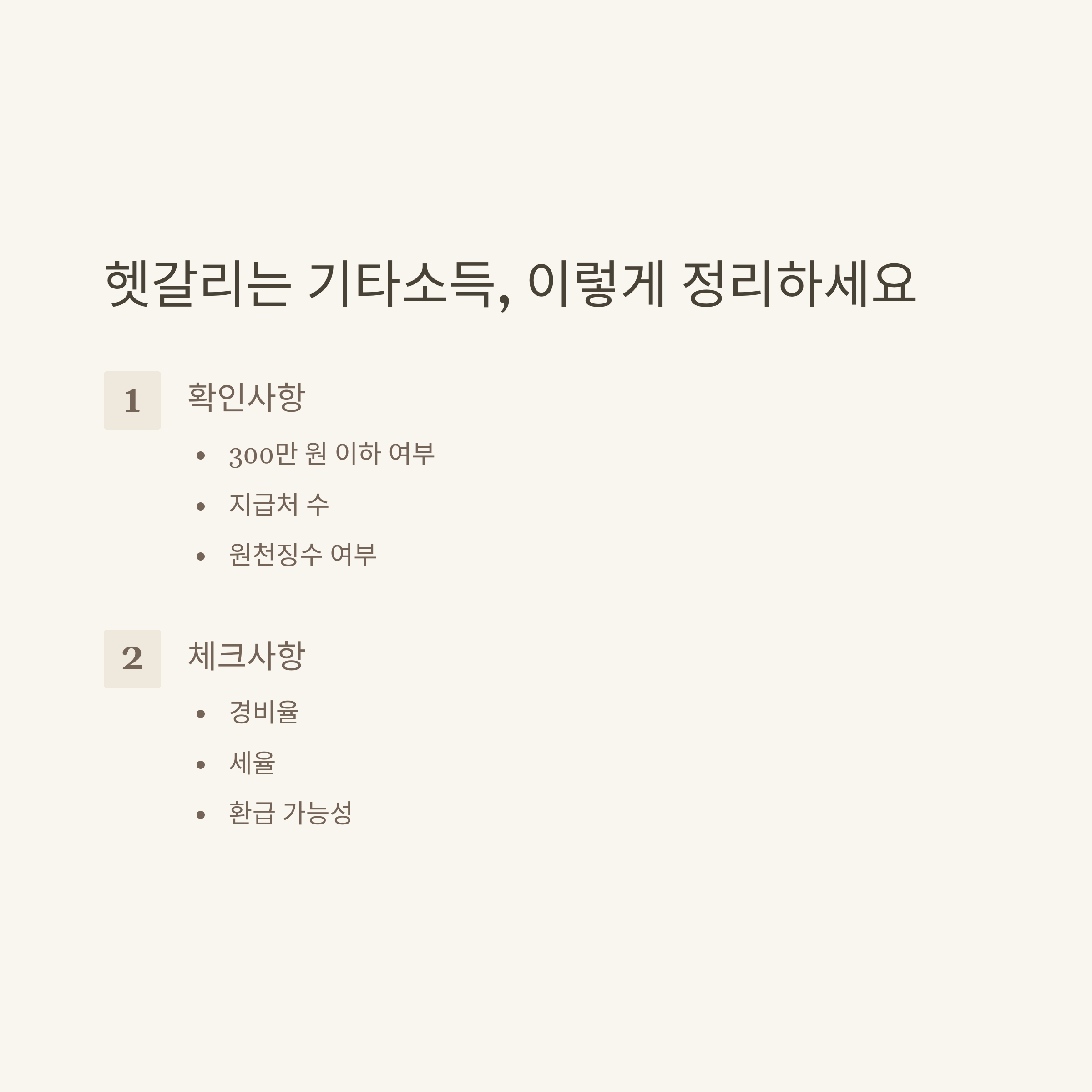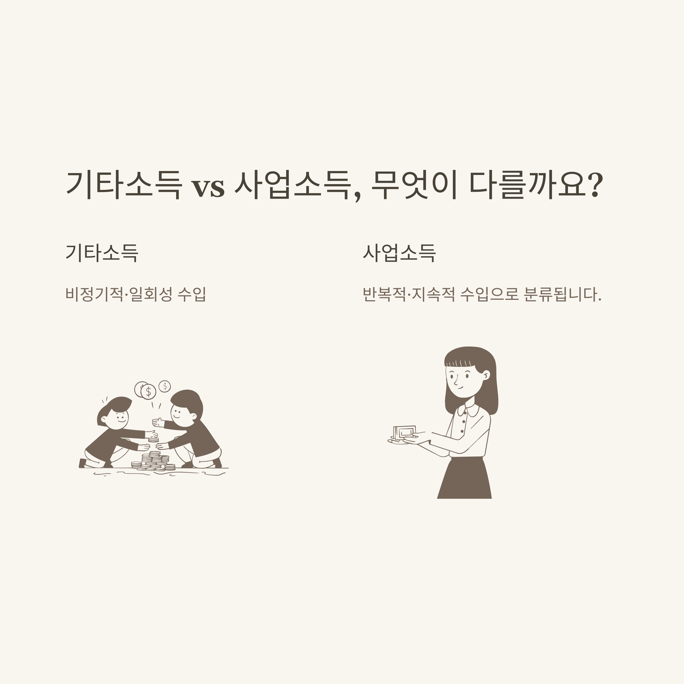 제가 실제로 겪어보니, 기타소득은 사업자 등록 없이 누구나 발생할 수 있고, 여러 가지 케이스로 잡힙니다. 다만, 한 달에 5만 원을 넘지 않거나 비정기적 소득일 때만 기타소득으로 인정되기 때문에, 자주 반복되면 사업소득으로 간주될 수 있다는 점 꼭 참고하셔야 해요.