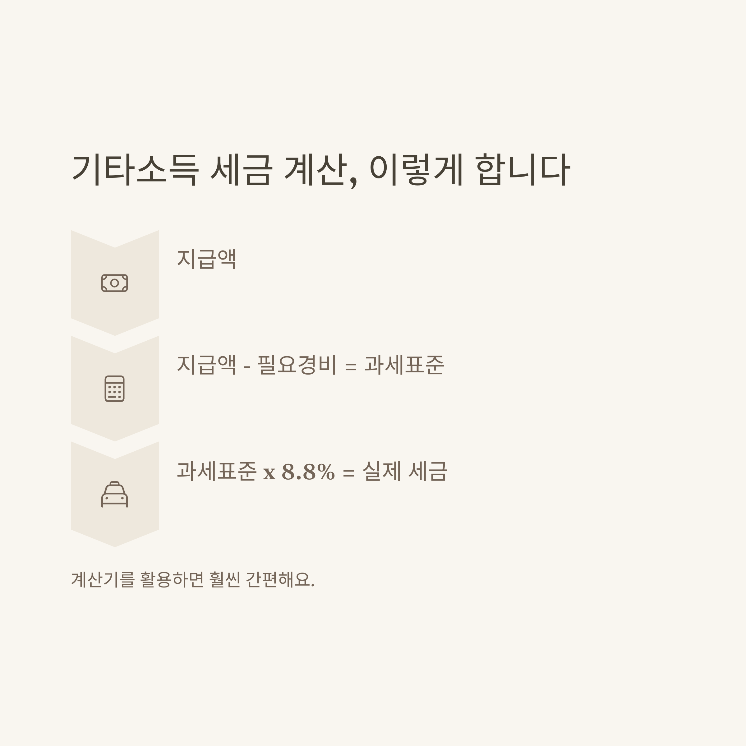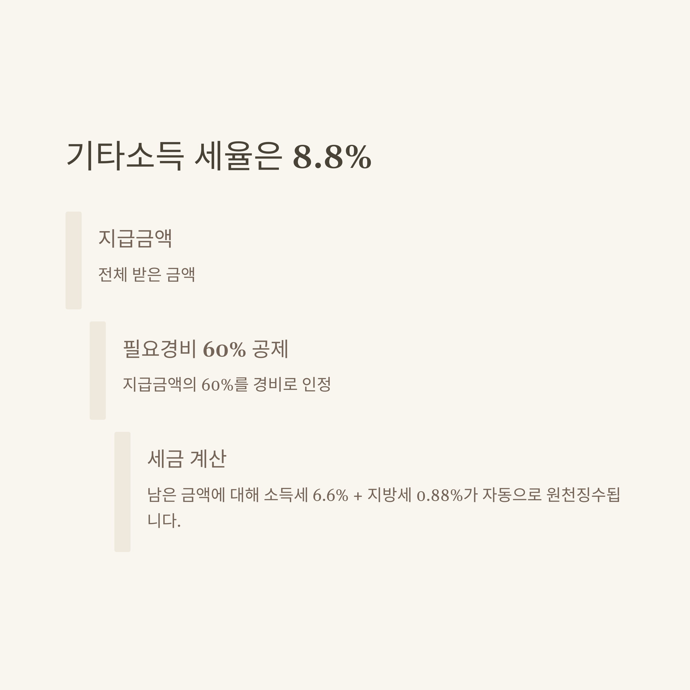 예를 들어, 기타소득이 100만 원이라면 필요경비(60%) 60만 원을 빼고 남은 40만 원이 과세표준이 되고, 여기에 8.8%의 세금(약 35,200원)이 부과됩니다. 이 공식만 기억하면 조금 더 쉽게 접근할 수 있습니다.