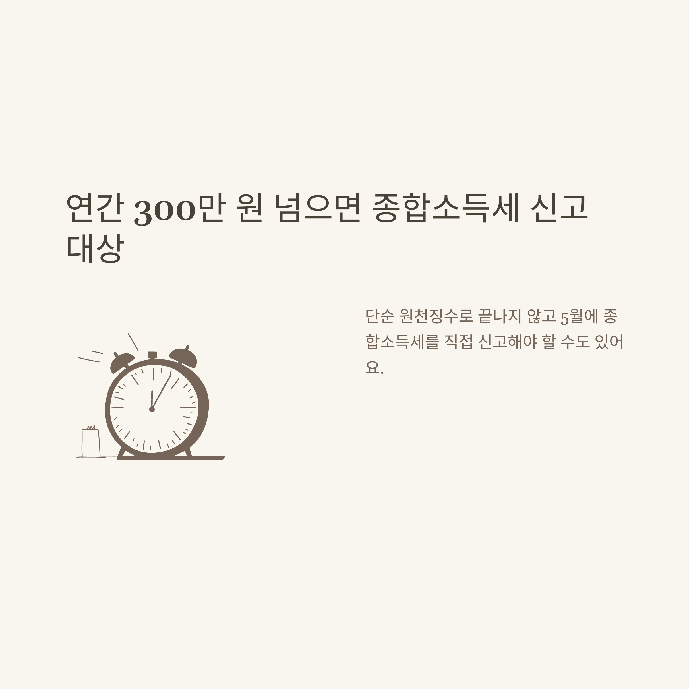 기타소득은 '원천징수로 끝난다'고 생각할 수 있지만, 연간 300만 원을 초과하거나, 여러 소득이 있는 경우에는 종합소득세 신고를 해야 합니다. 저도 처음에는 “회사에서 세금 다 떼줬으니 더 이상 할 게 없다”라고 생각했는데, 어느 해엔가 연간 기타소득이 300만 원을 넘으면서 국세청에서 “종합소득세 신고하세요”라는 안내를 받았던 기억이 있습니다.