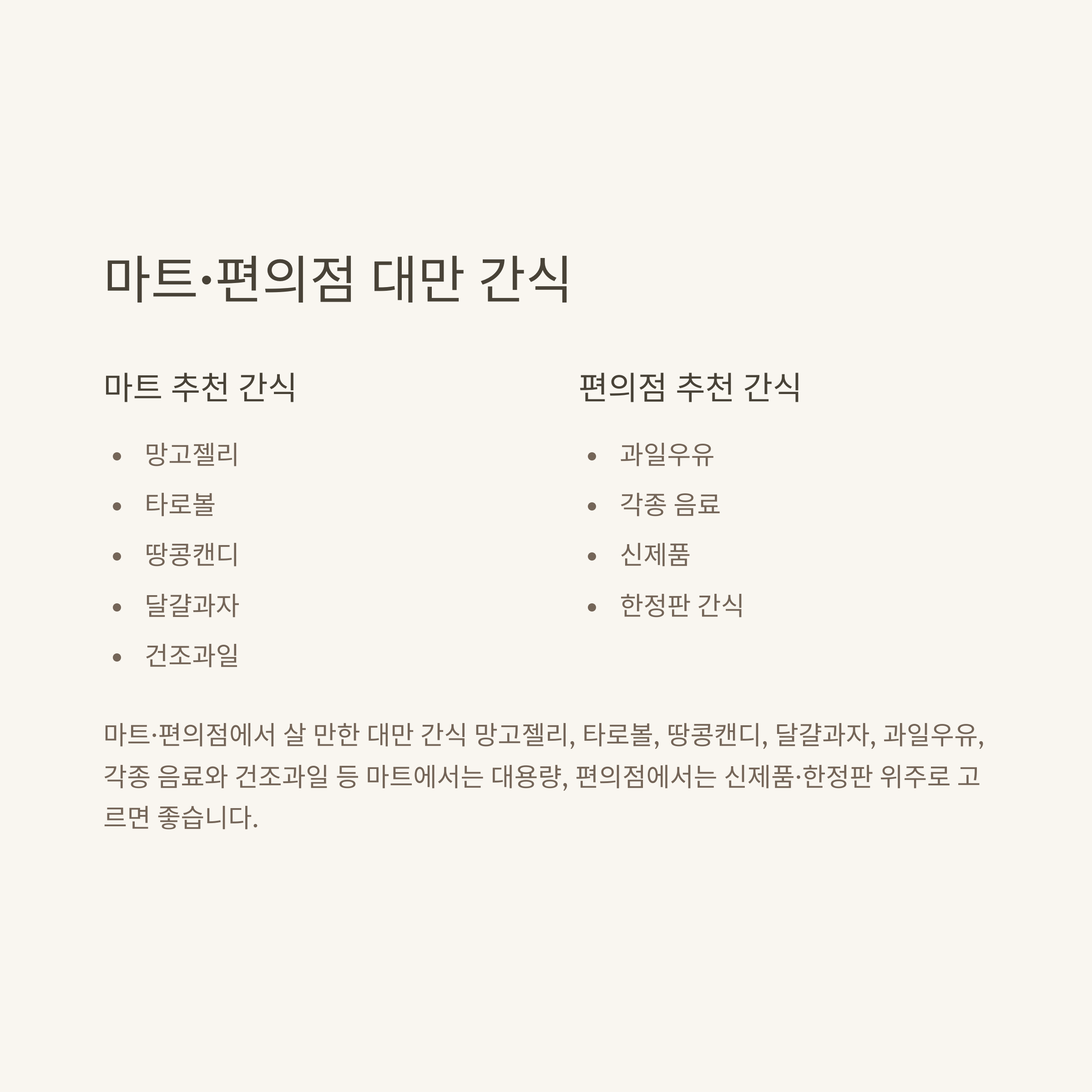제가 대만 갈 때마다 빼놓지 않고 들르는 곳이 바로 PX마트, 세븐일레븐, 패밀리마트 같은 대형 마트와 편의점입니다. 특히 마트에서만 만날 수 있는 현지 한정 과자, 음료, 그리고 저렴한 건조과일이나 육포는 돌아오는 날 캐리어에 꼭 담아오는 쇼핑리스트 1순위였어요. 제가 직접 사보고 주변 사람들에게 선물해본 대만 간식들은 아래와 같습니다.