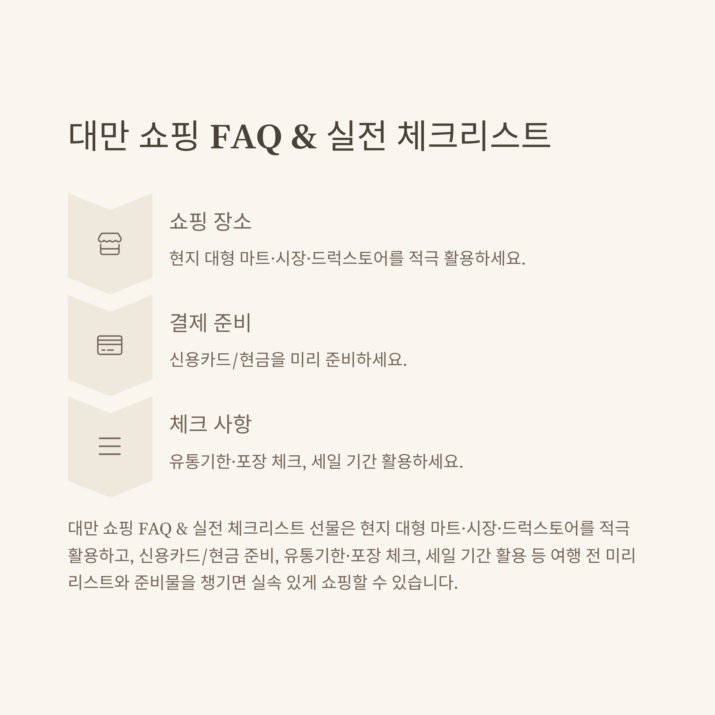 여행 준비하면서 제일 고민됐던 것 중 하나가 “대만에서 뭐 사와야 후회 없을까?”였어요. 인터넷에서 ‘대만쇼핑리스트’를 아무리 찾아도, 실질적으로 직접 사 본 사람의 솔직한 후기가 부족하더라고요. 저 역시 첫 대만 여행 땐 마트에서 이것저것 충동적으로 담았다가, 나중에 ‘아, 이걸 왜 샀지?’ 싶었던 적도 많았습니다. 그래서 두 번째 대만 여행 땐 진짜 현지인들한테 물어보고, 직접 써보고, 먹어보고, 오래 두고 기억에 남는 것만 정리해서 리스트를 만들었습니다. 가격, 실용성, 선물용, 브랜드 가치까지 다 따져보고, 돌아와서도 가족·친구가 만족했던 품목만 골랐습니다. 이 글을 통해, 저처럼 고민하는 분들이 ‘대만 기념품’, ‘대만 쇼핑’, ‘대만 쇼핑 브랜드’, ‘대만 쇼핑 추천’, ‘대만 특산품’, ‘대만여행 쇼핑리스트’를 제대로 챙길 수 있도록, 실제 경험 기반으로 하나하나 풀어서 설명드리겠습니다. 좀 더 공식적인 정보는 대만관광청 공식 쇼핑 가이드에서도 확인할 수 있습니다.