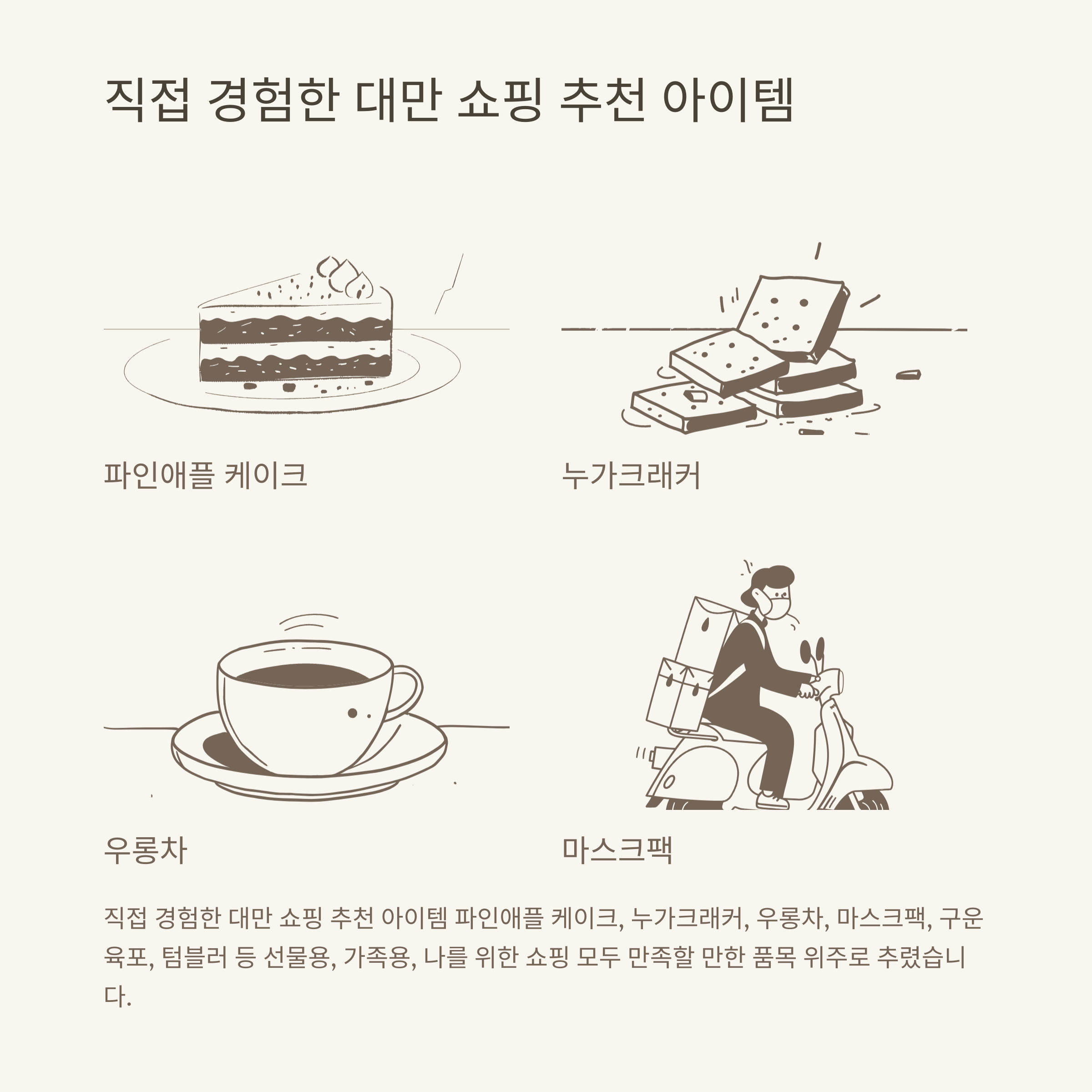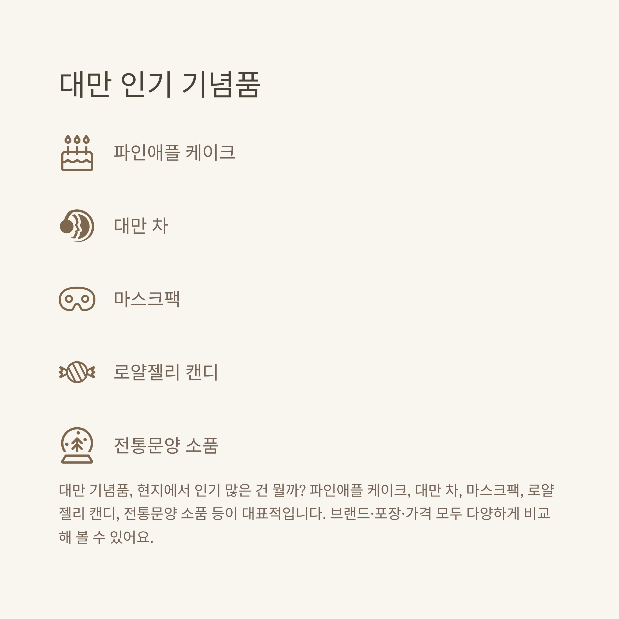 여행 선물 고민할 때 가장 먼저 검색해보는 게 ‘대만 기념품’이죠. 저도 처음 대만을 갔을 때, 정말 많은 사람들이 추천해준 기념품 리스트를 가지고 출국했습니다. 그런데 실제로 대만에서 현지인과 대화해보고, 직접 쇼핑해보니 국내 검색과는 다소 다른 순위가 나오더라고요. 현지 친구가 “이건 한국 사람들이 더 좋아해!”라고 추천해준 게 바로 파인애플 케이크였습니다. 정말 다양한 브랜드(써니힐즈, 치아더, 샤오미 등)가 있어서, 시식해보고 골라오는 재미도 쏠쏠했어요. 또 대만 차(우롱차, 동방미인차 등)도 선물용으로 많이 샀습니다. 저는 ‘츄위위안(春水堂)’이나 ‘텐런차(天仁茗茶)’ 등 대만 브랜드 티숍에서 직접 구매해서, 포장도 예쁘고 가격대별로 고르기 좋아 만족도가 높았습니다. 소소하게 챙길 수 있는 대만 마스크팩, 로얄젤리 캔디, 펑리수 스노볼, 미니 자석이나 열쇠고리, 그리고 대만의 국화문양이 들어간 상품들도 현지에서 인기가 많았습니다. 아래는 현지인, 여행객이 많이 찾는 대만 기념품 베스트 5와 특징입니다.