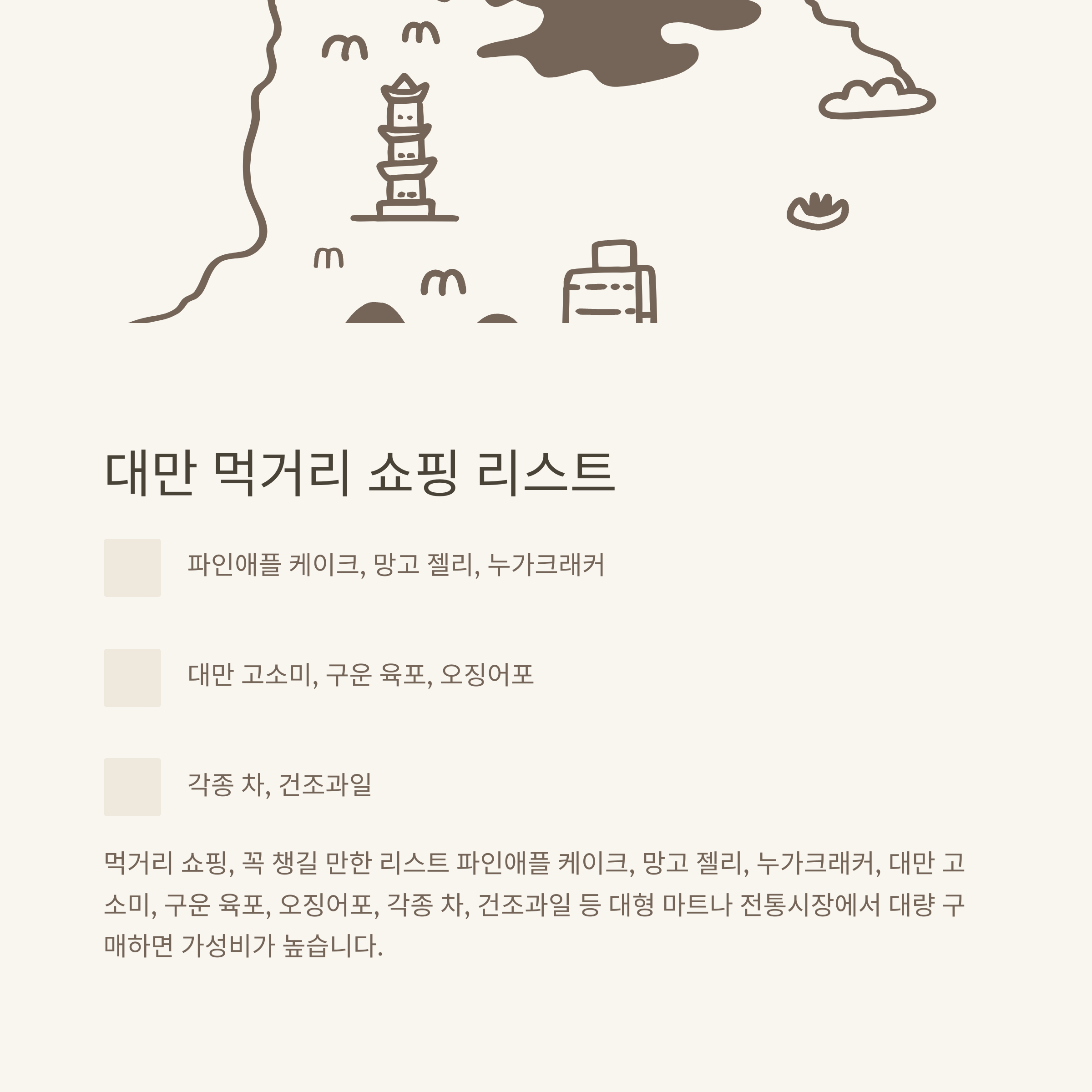여행 예산에 여유가 있다면, 대만 특산주나 지역 한정판 간식, 한방 재료 등도 시도해보는 걸 추천합니다. 더 많은 쇼핑 추천 아이템은 대만관광청 공식 추천리스트에서 확인해보세요.