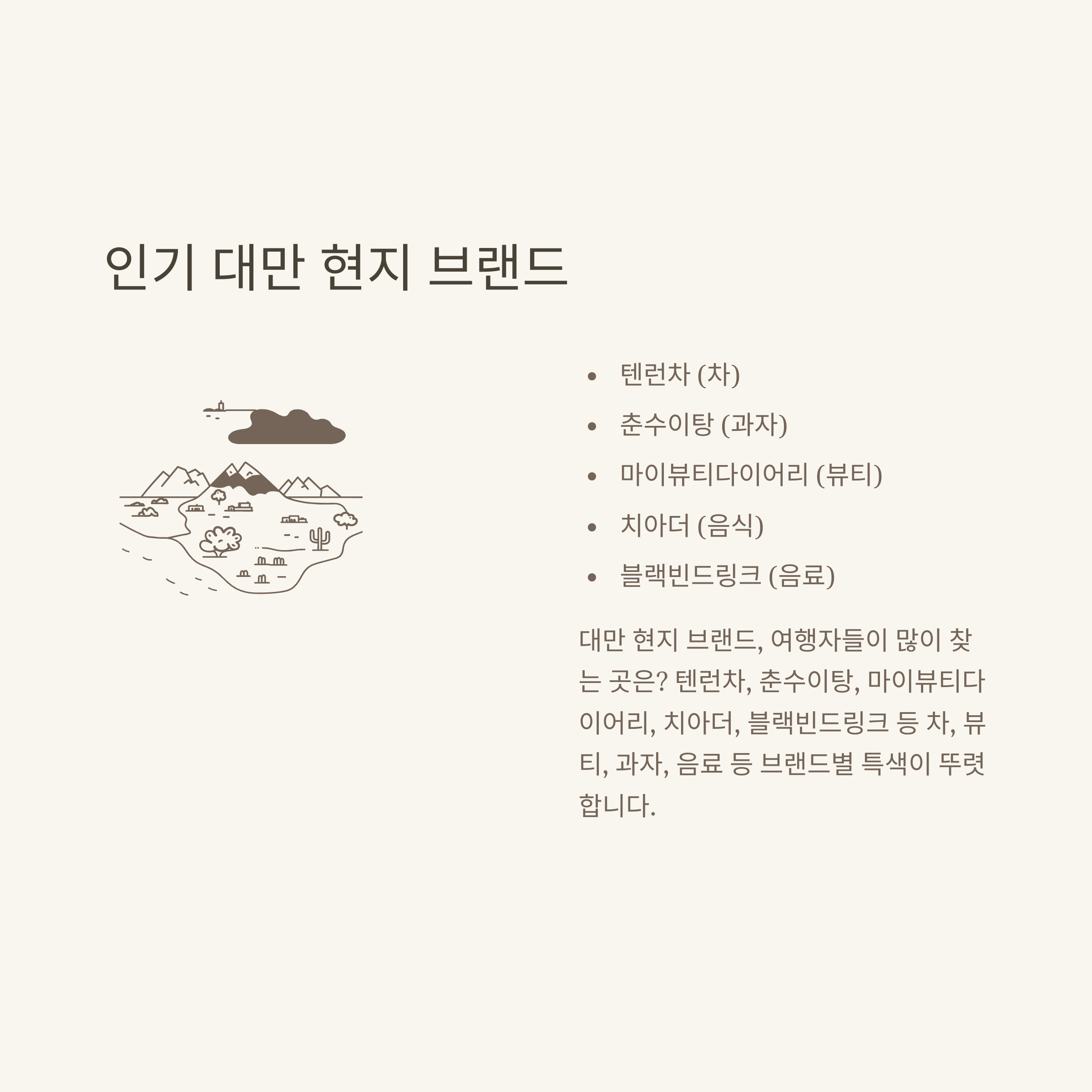 대만 쇼핑하면 빠질 수 없는 게 바로 현지 브랜드 쇼핑입니다. 저는 처음에 대만 브랜드가 뭐가 있을지 잘 몰랐는데, 현지에서 직접 둘러보니 생각보다 세계적으로 유명하거나, 오직 대만에서만 만날 수 있는 브랜드가 많았습니다. 특히 대만은 차(茶) 문화가 발달해서 티 전문 브랜드들이 엄청 많았어요. ‘텐런차(天仁茗茶)’는 대만 전역에 매장이 있고, 선물용으로 세련된 패키지가 많아 저도 자주 이용했습니다. 또, 버블티 원조 브랜드 ‘춘수이탕(春水堂)’은 음료도 직접 마시고, 티 세트나 텀블러를 선물로 사오는 여행객이 많았습니다. 뷰티 쪽도 의외로 강세입니다. ‘마이뷰티다이어리(My Beauty Diary)’는 마스크팩 하나로 유명해져서, 대만 드럭스토어에서 묶음 할인할 때 꼭 사게 되더라고요. 또, 건강식품 브랜드 ‘블랙빈드링크’, ‘야쿠르트 젤리’ 등도 인기 품목 중 하나입니다. 아래는 여행자들이 많이 찾는 대만 대표 브랜드와 추천 아이템을 표로 정리해봤습니다.