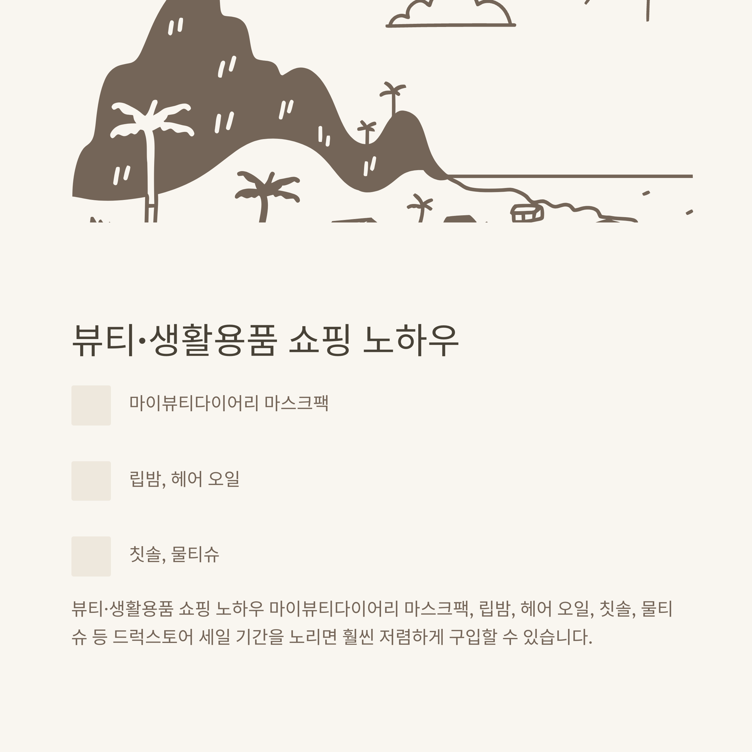 대만 여행 가서 꼭 챙기는 쇼핑 리스트 중에 뷰티, 생활용품도 빠질 수 없죠. 저는 특히 대만 드럭스토어(왓슨스, 코스메드)를 일부러 들러서 신제품이나 현지에서만 볼 수 있는 브랜드를 비교하는 재미에 푹 빠졌었어요. 가성비 뛰어난 마스크팩(마이뷰티다이어리, 메디힐), 미스트, 립밤, 헤어 오일 같은 뷰티템은 물론, 대만 한정판 캐릭터 디자인의 칫솔, 치약, 향균 물티슈, 일회용 슬리퍼 등 생활용품도 다양하게 구입했습니다. 드럭스토어는 세일 기간이 정말 자주 돌아오고, 1+1, 2+1 등 대량 구매 이벤트가 많아서 가족·지인 선물용으로 여유 있게 챙겨가기에 딱 좋았습니다. 저는 한 번은 대만 현지 직원에게 ‘한국에서 어떤 제품이 제일 인기냐’고 물어봤더니, “마이뷰티다이어리 마스크팩이랑 대만산 립밤, 올리브 오일 헤어 에센스”를 추천해줬어요. 직접 사용해보니 품질도 꽤 괜찮더라고요. 아래 표는 대만 드럭스토어 인기 뷰티·생활용품 요약입니다.