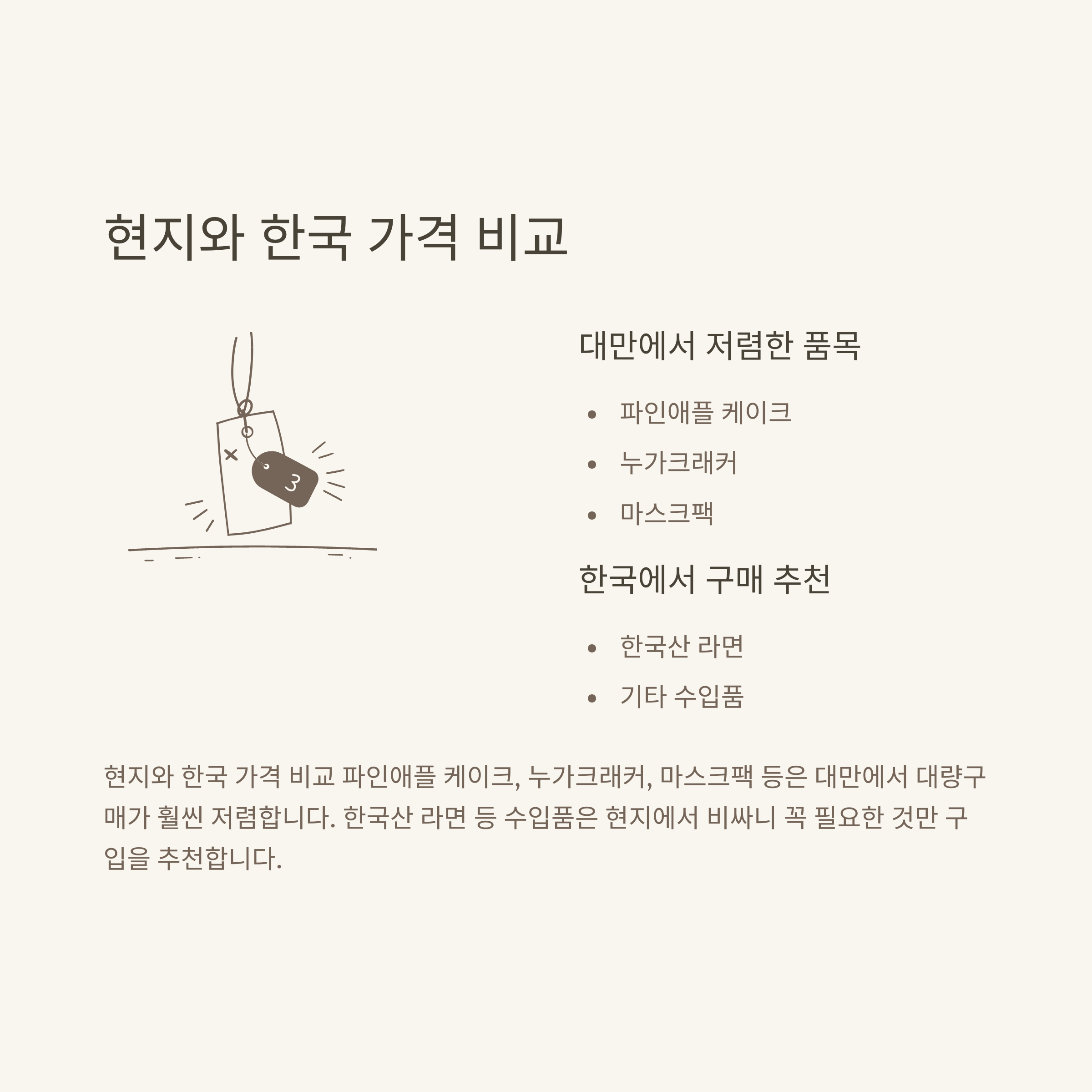 대만여행 쇼핑리스트를 짤 때 가장 중요했던 게 “한국이랑 비교해서 얼마나 저렴하거나 비싼지”였어요. 저는 직접 가격표를 사진으로 남겨둘 정도로 꼼꼼하게 체크했는데, 현지에서 사면 확실히 이득인 품목과, 오히려 한국이 더 저렴한 품목이 분명하게 나뉘었습니다. 가장 대표적인 예가 파인애플 케이크와 누가크래커, 마스크팩이었는데요. 대만 현지 대형 마트(또는 드럭스토어)에서 구입하면, 한국보다 20~50% 이상 저렴한 경우가 많았어요. 반면 한국산 라면, 과자, 음료수 등은 수입품이라서 가격이 비싼 편이었습니다. 아래 표는 현지 구매 vs 한국 구매 가격을 항목별로 비교한 결과입니다.