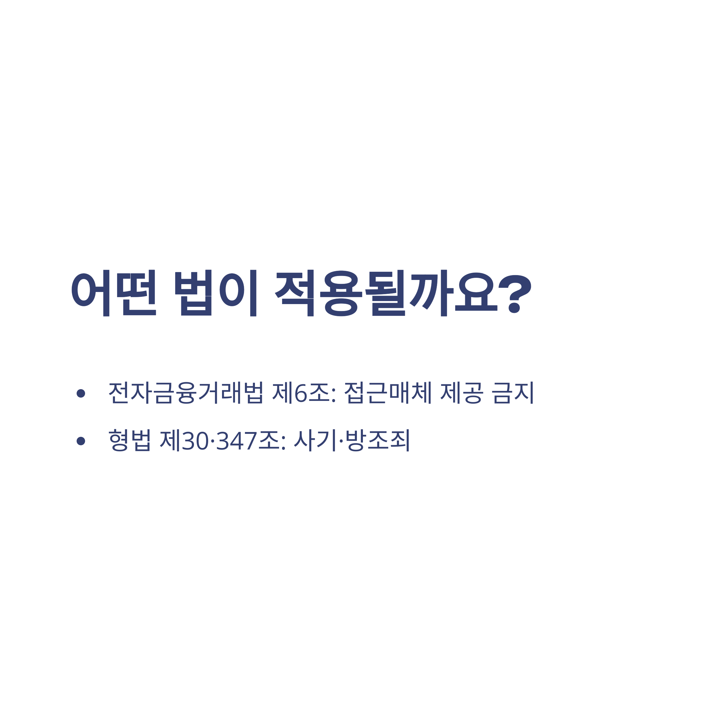 | 전자금융거래법 제6조 | 접근매체 제공 금지 | 5년 이하 징역 또는 3천만 원 이하 벌금 |