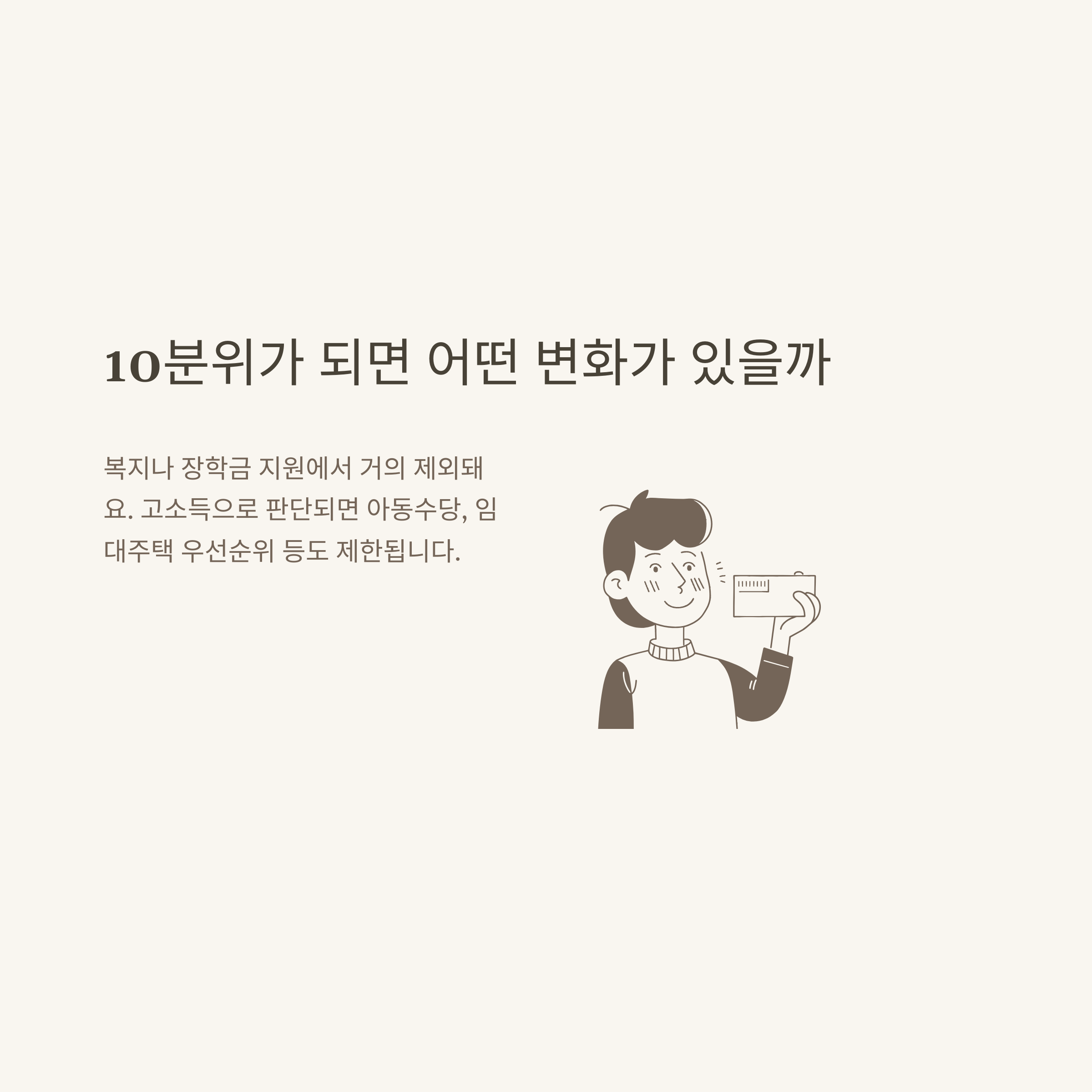 저는 소득분위 10분위로 분류된 친구와 이야기를 나눈 적이 있는데, 혜택이 아예 없거나 매우 제한적이어서 실망하는 경우가 많았습니다. 실제로 국가장학금이나 각종 복지, 공공임대주택 등의 지원은 소득분위 1~8분위까지에 집중되고, 9~10분위는 대부분 제외되더라고요.