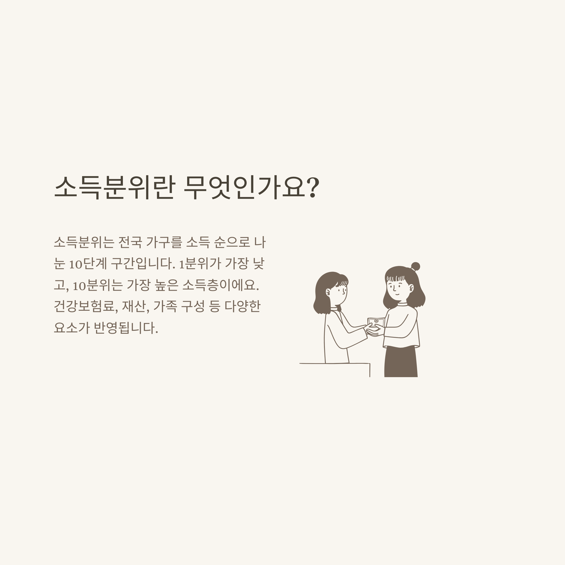 소득분위는 어떻게 정해질까? 간단히 말하면, 가구의 소득(근로소득, 사업소득, 재산 등)을 정부 기준으로 환산해서 전국 가구와 비교해 10등분 한 등급입니다. 1분위가 소득이 가장 낮고, 10분위가 가장 높죠.