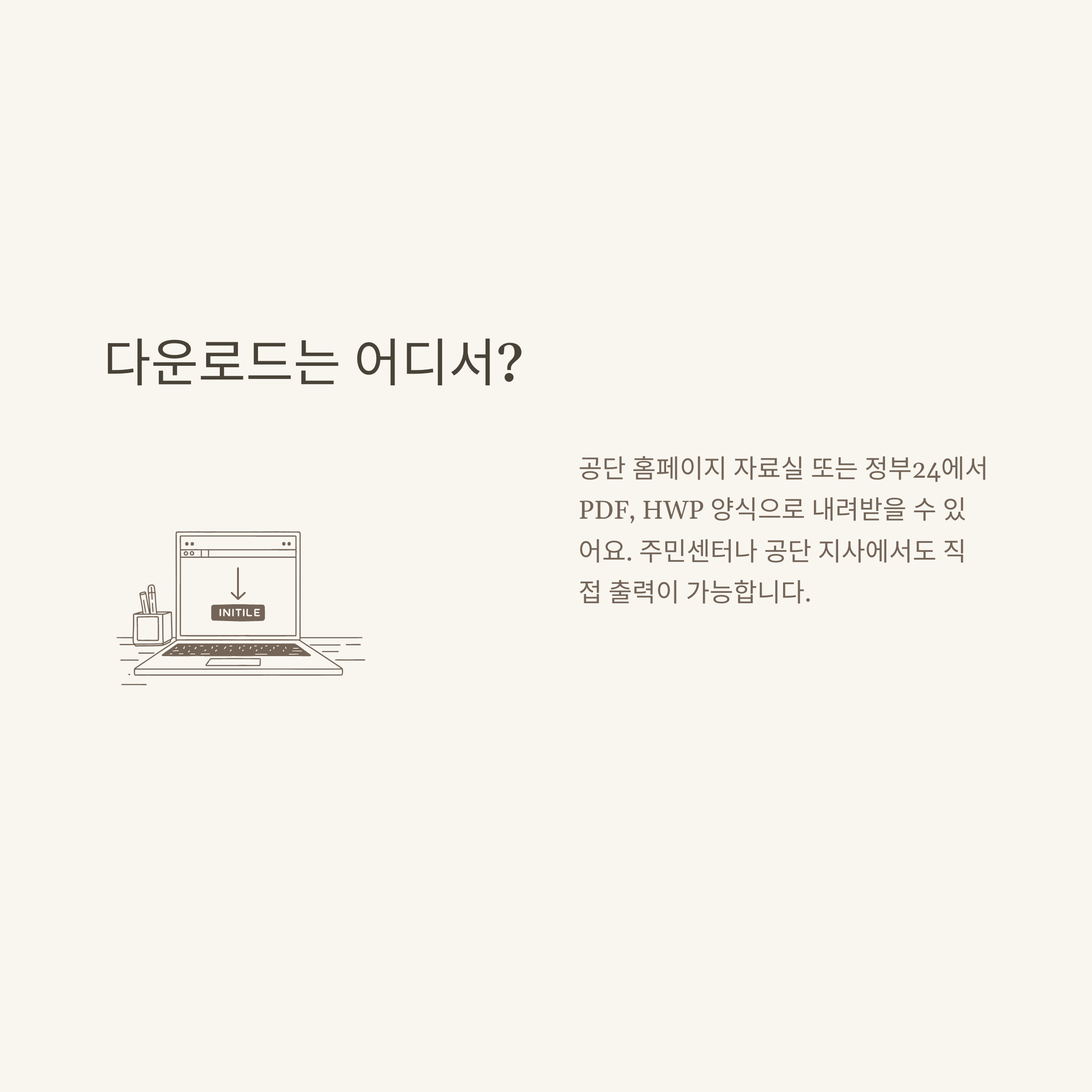 | 다운로드 | 공단 홈페이지, 정부24 | PDF, HWP 지원 |