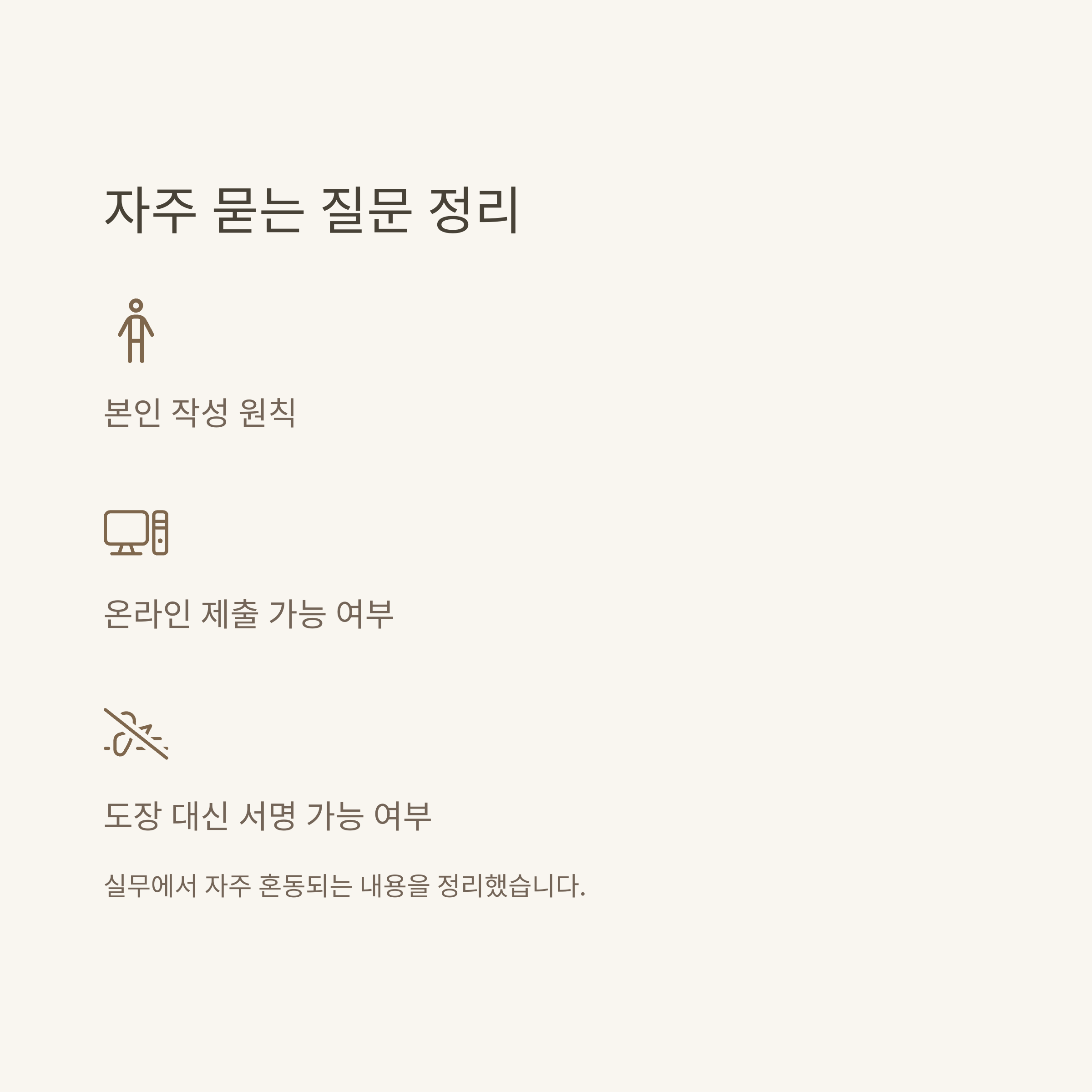 A. 원칙적으로 본인이 직접 작성해야 하며, 대리인 제출 시에는 위임장과 대리인 신분증 사본이 필요합니다. - Q3. 언제 제출해야 하나요?