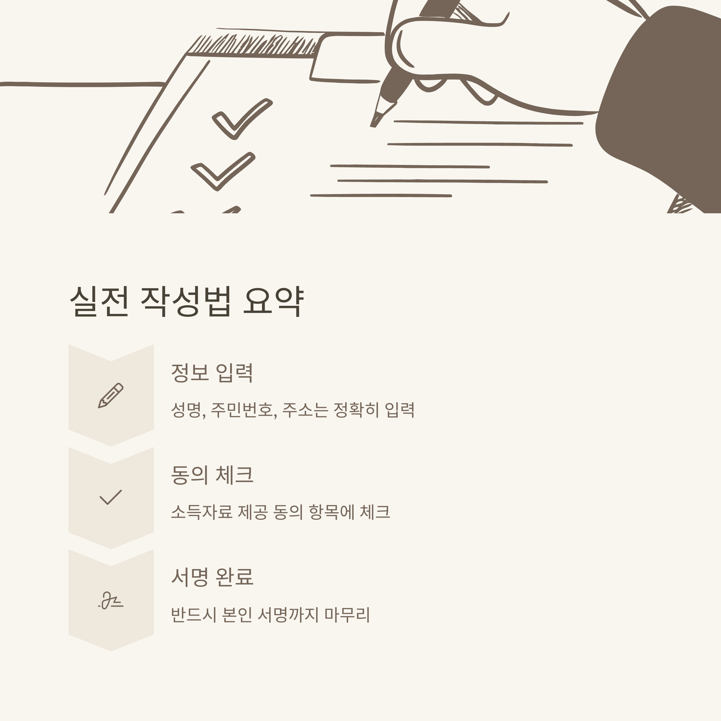 양식을 받아서 막상 작성할 때 “내가 이 부분을 잘 써도 되나?” 고민이 진짜 많았습니다. 저도 예전에 한 번 오타나 주민번호 오기재 때문에 다시 작성했던 경험이 있는데, 꼭 신분증을 옆에 두고 정확하게 입력하는 게 좋습니다. 실무에서 놓치기 쉬운 주의점들을 정리해봤어요.