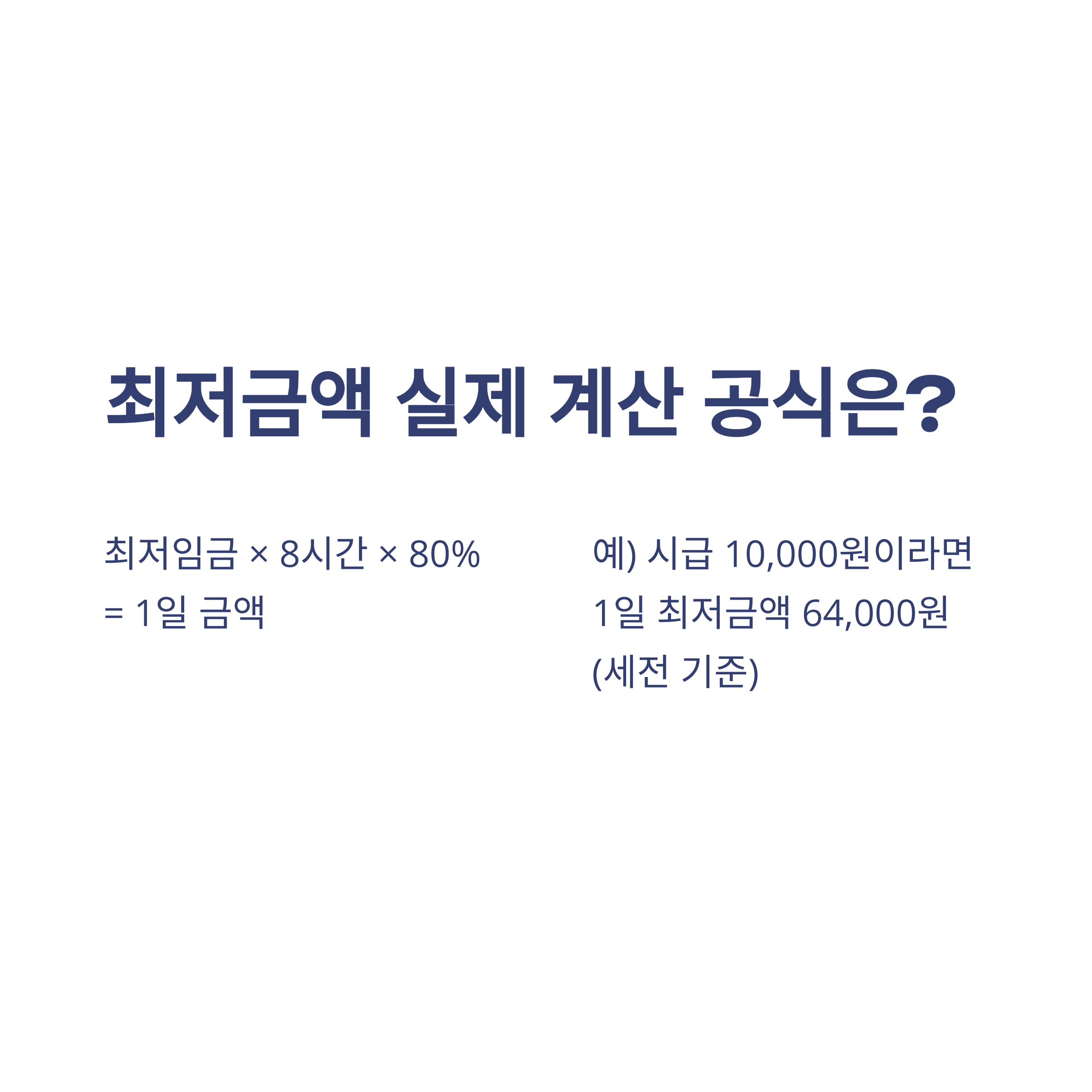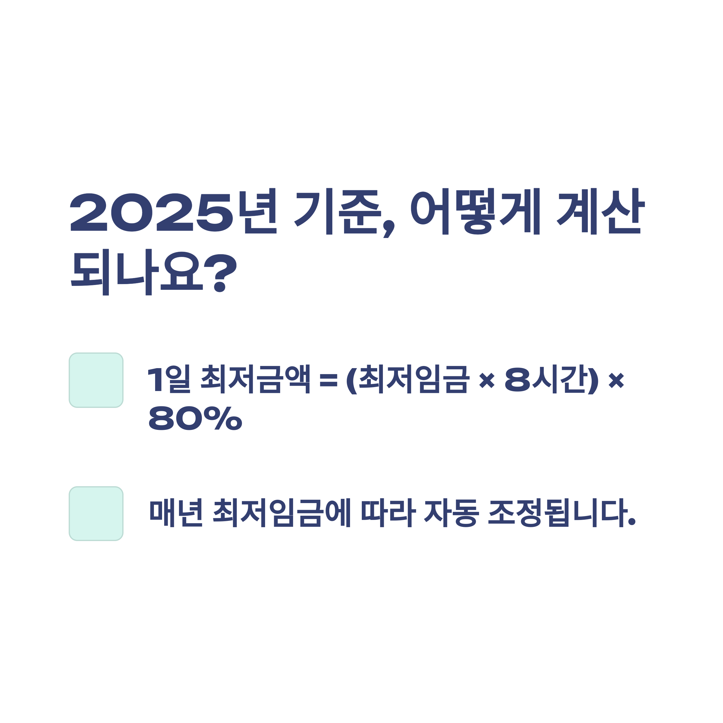 | 1일 최저금액 | 최저임금×8시간×80% | 2025년 기준 |