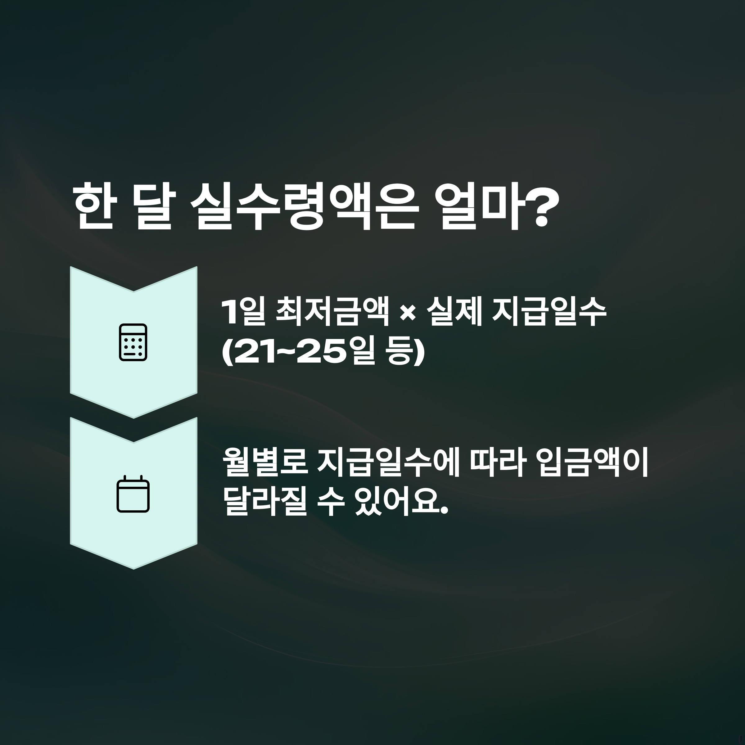 - 1일 최저금액 × 월 지급일수(21~25일 등) = 월 실수령액