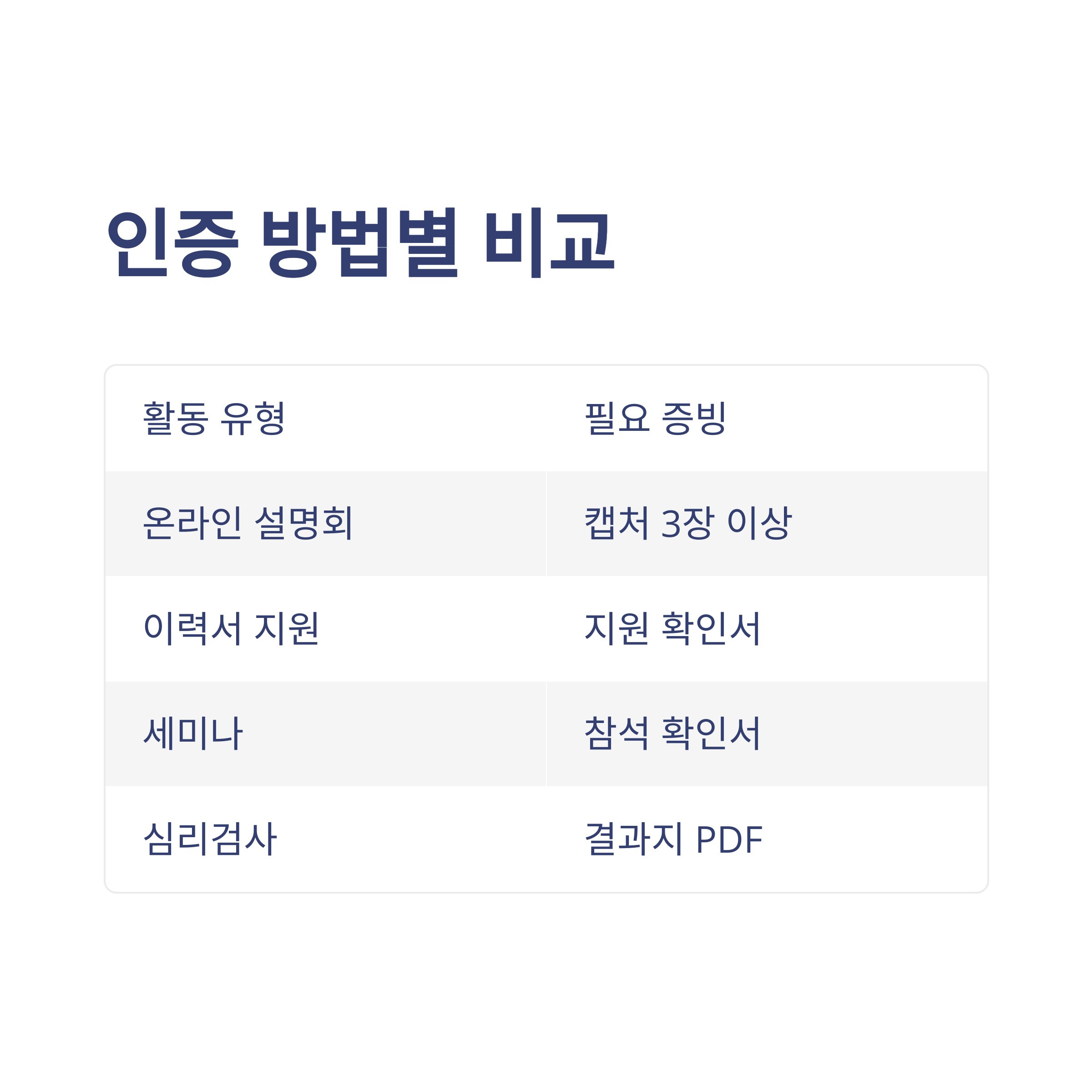각 활동별로 제출할 수 있는 증빙서류 종류와 준비 방법을 비교하면, 무엇을 언제 어떻게 준비해야 할지 한눈에 파악할 수 있습니다. 저는 이 비교표를 인쇄해 책상에 붙여두고 체크리스트로 활용했어요.