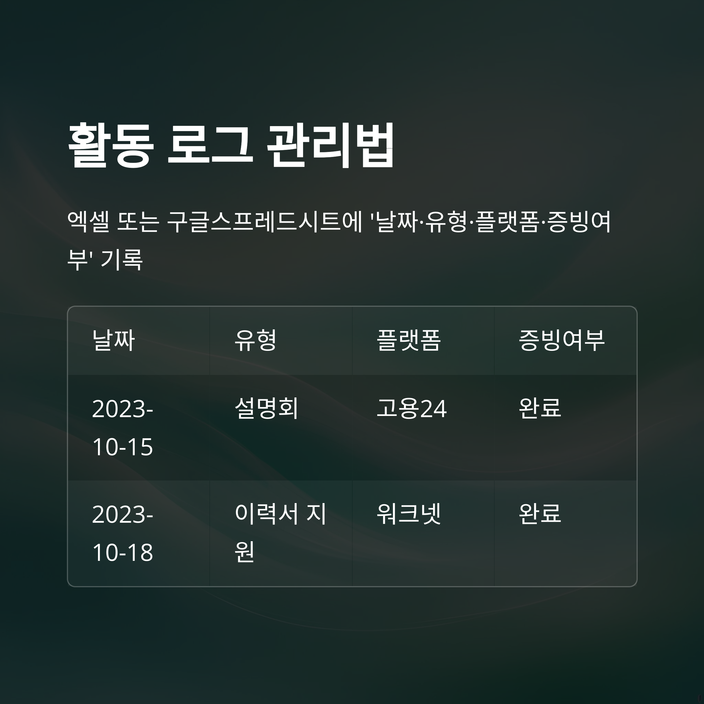 저는 엑셀 시트에 ‘날짜·활동유형·플랫폼·증빙여부’ 칼럼을 만들어 매일 기록했어요. 이렇게 체계적으로 관리하면 증빙 누락 위험을 줄이고, 고용센터 제출 전 최종 점검이 쉽습니다. 특히 활동 후 바로 캡처하고 파일명과 로그를 함께 정리해 두면, 급박하게 증빙을 제출해야 할 때도 당황하지 않더라고요.