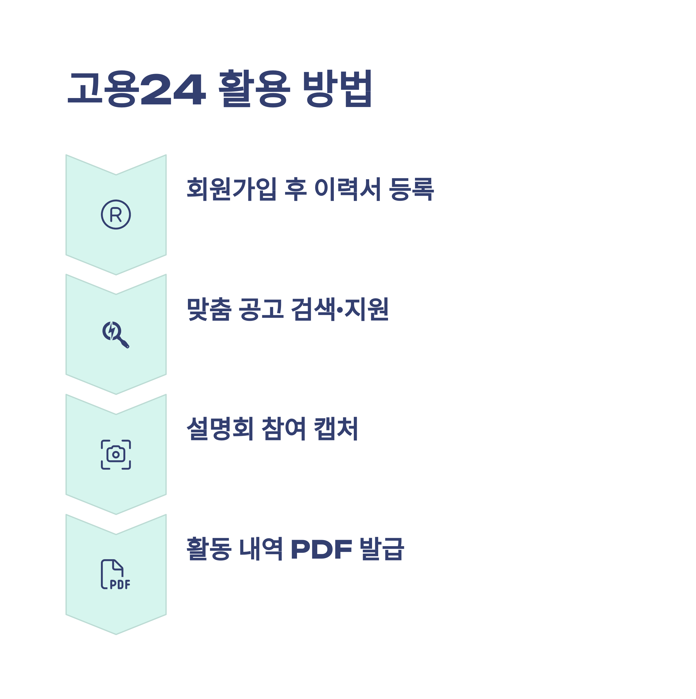 제가 제일 먼저 시도한 방법은 고용보험 사이트 ‘고용24’에서 제공하는 구직서비스 활용이었어요. 고용24는 이력서 등록, 취업 추천, 온라인 채용설명회 등 다양한 기능을 무료로 제공합니다.