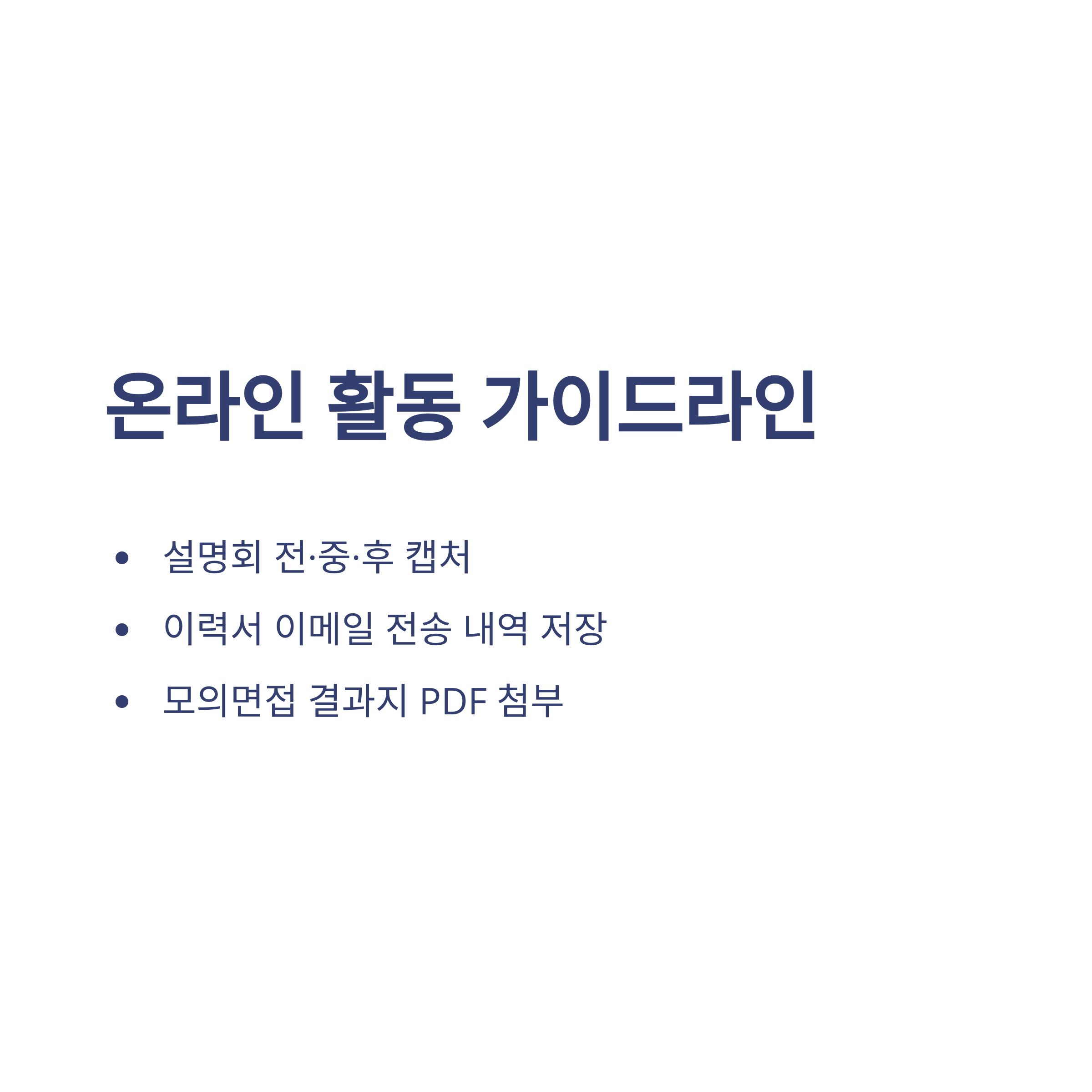 – 설명회 시작 전 화면, 중간 Q&A 화면, 종료 후 인증 화면을 모두 캡처합니다. - 이력서 이메일 지원