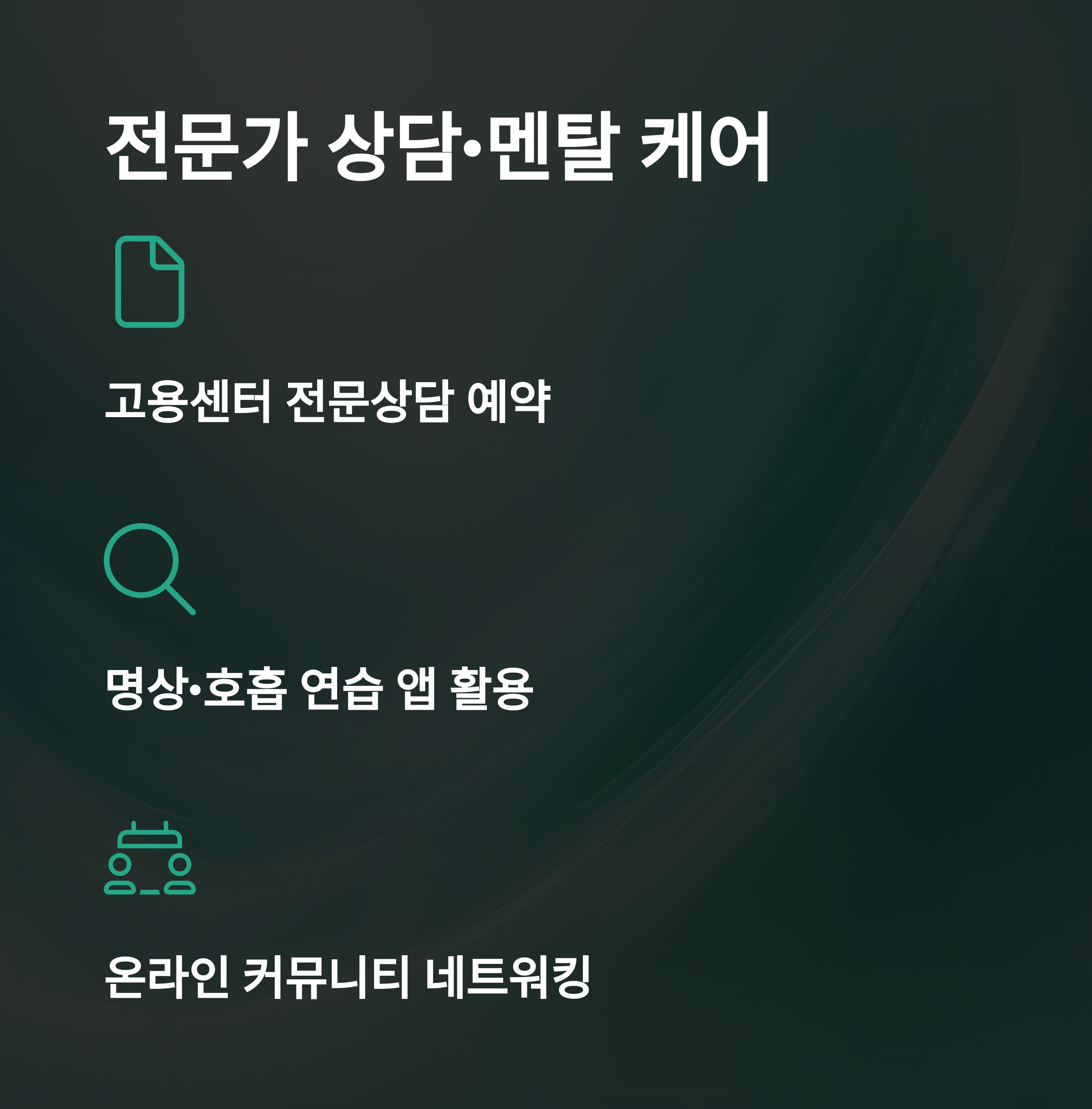 – 고용센터 사이트에서 전문상담 예약 후 방문해보세요. - 멘탈 케어 앱 활용
