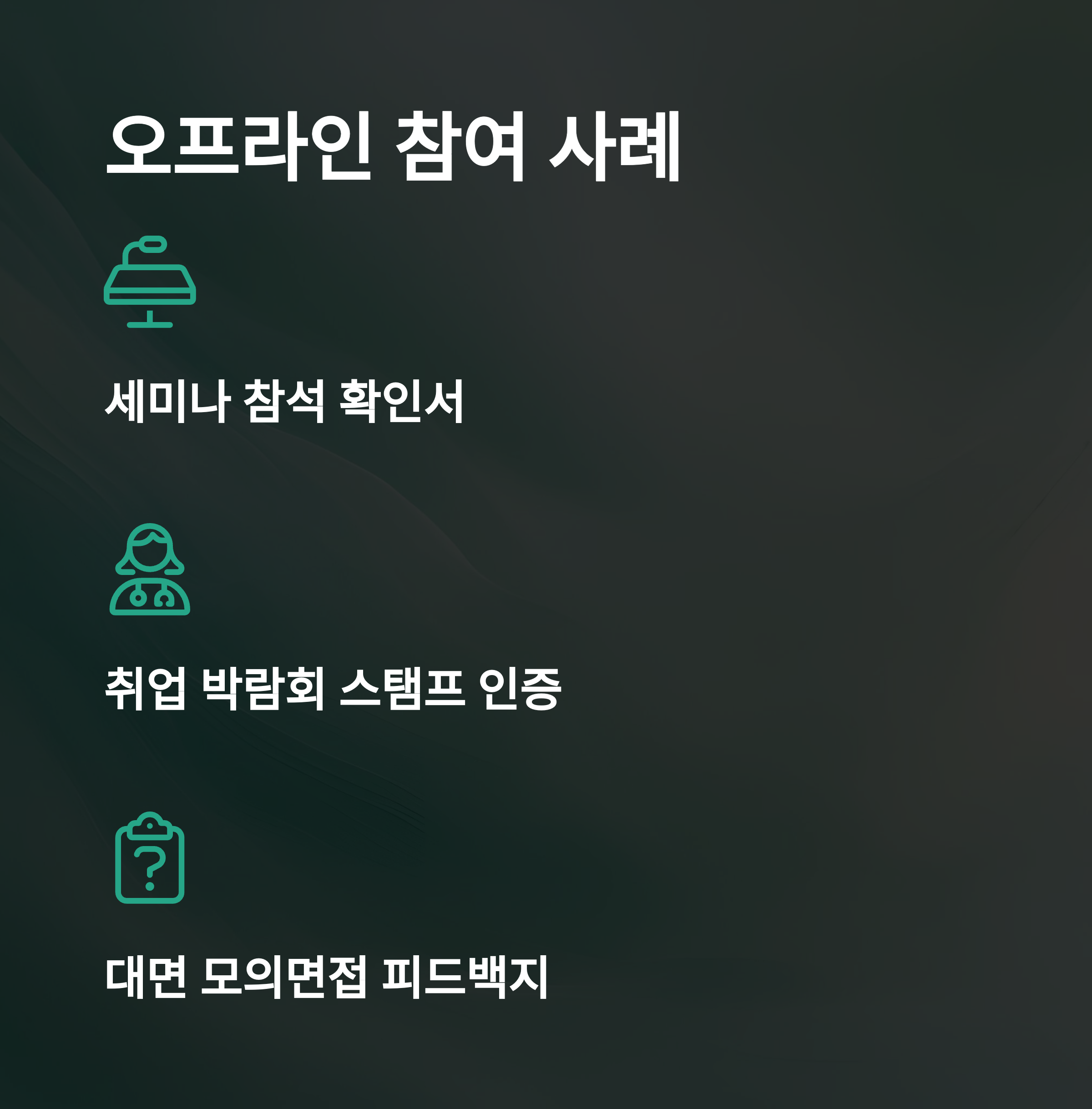 저는 5차 구직활동에서 지역 고용센터 주최 ‘취업 실전 세미나’에 참여했는데, 직접 면대면으로 전문가 강연을 듣고 질의응답한 기록이 증빙으로 인정되더라고요. 세미나 참여 후 받은 ‘참석 확인서’에 이름과 일시, 기관명이 명시되어 있어 제출이 아주 수월했습니다.
