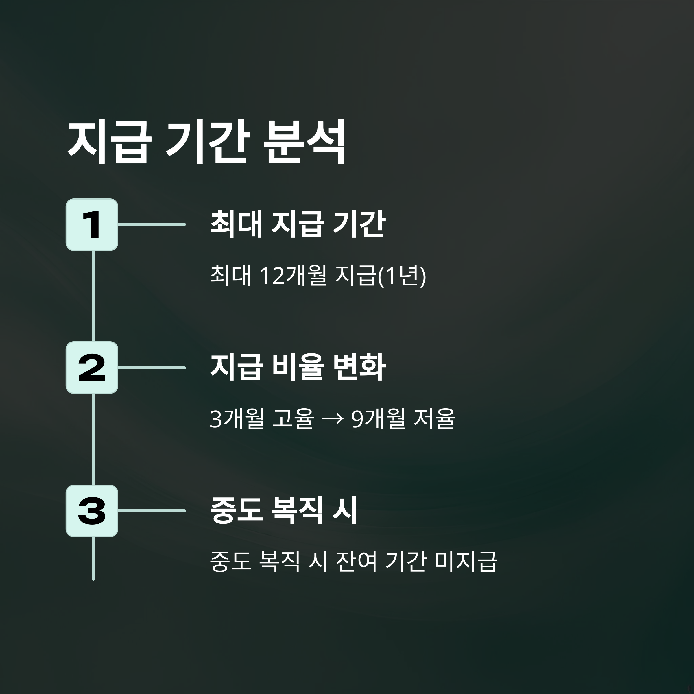 육아휴직급여는 최대 12개월(1년) 동안 지급됩니다. 이 중 최초 3개월은 80%로, 이후 9개월은 50%로 지급되며, 중도 복직 시 남은 기간은 중단됩니다. 저는 첫 6개월간은 집중 육아에 전념하고, 후반 6개월은 파트타임 근무와 병행하며 급여를 최적화했는데, 이렇게 기간별 계획을 세우면 재정적으로 보다 안정적인 육아 기간을 보낼 수 있습니다.