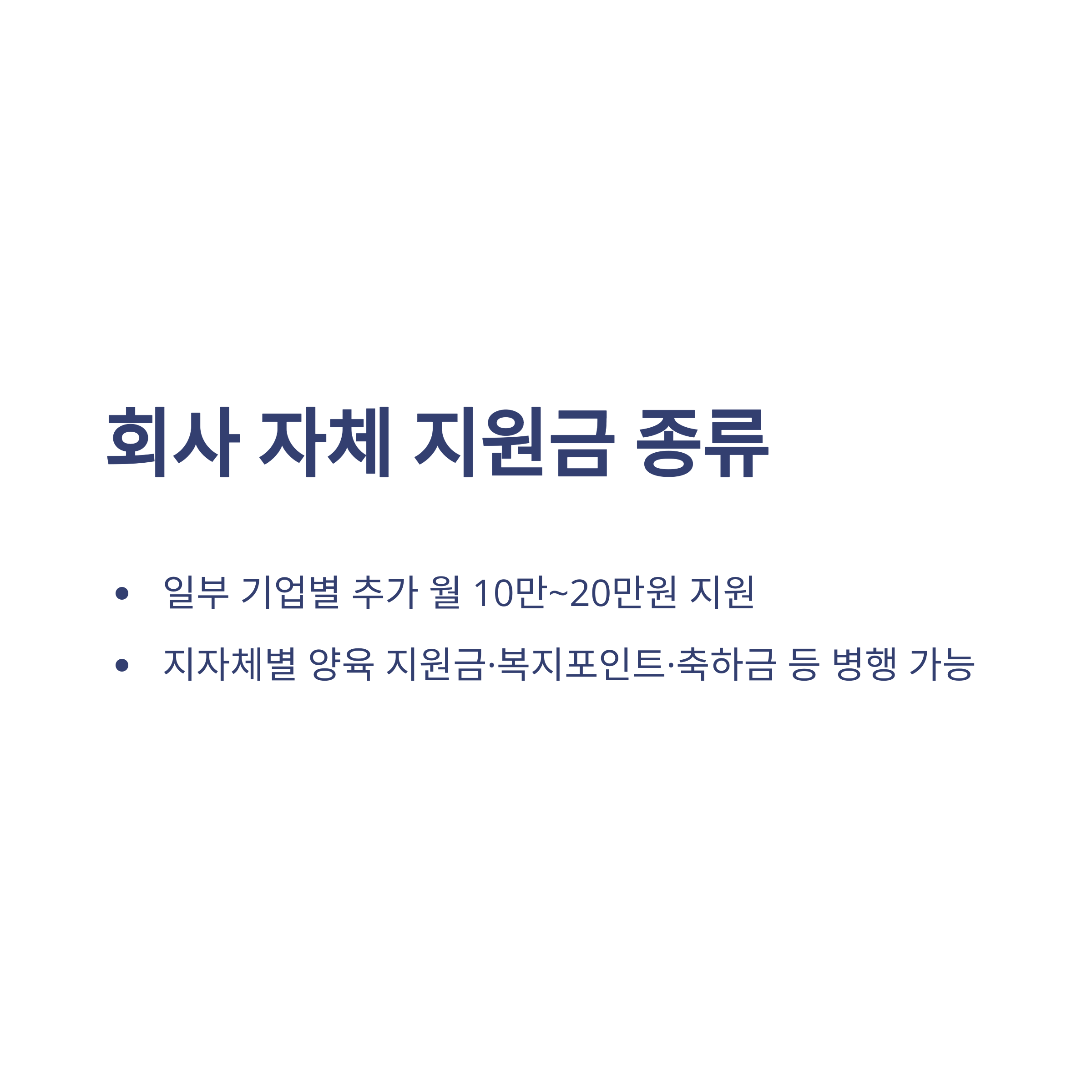 정부 지원 외에도 일부 기업에서는 자녀 양육 부담 완화를 위해 회사 자체적으로 추가 지원금을 제공하기도 합니다. 제가 다니던 중견기업은 첫 3개월에 월 20만원을, 이후 6개월에는 월 10만원을 지급해 총 180만원을 더 받았는데, 덕분에 육아용품 구매에 큰 도움이 되었죠. 이 외에도 지자체별 육아 지원금, 복지포인트, 임신·출산 축하금 등이 있으며, 지역별 지원 내용은 해당 시·군·구청 홈페이지에서 확인할 수 있습니다.