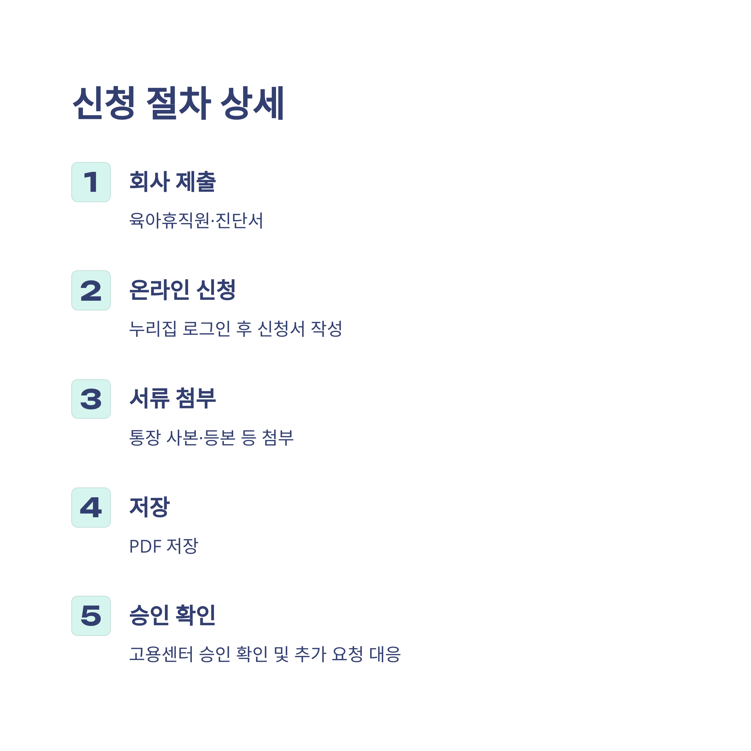 육아휴직급여를 신청할 때는 다음 단계를 꼭 순서대로 진행해야 합니다. 제가 헷갈려서 한 번 더 수정했던 경험이 있어, 순서대로 체크리스트를 만들어 활용했습니다.