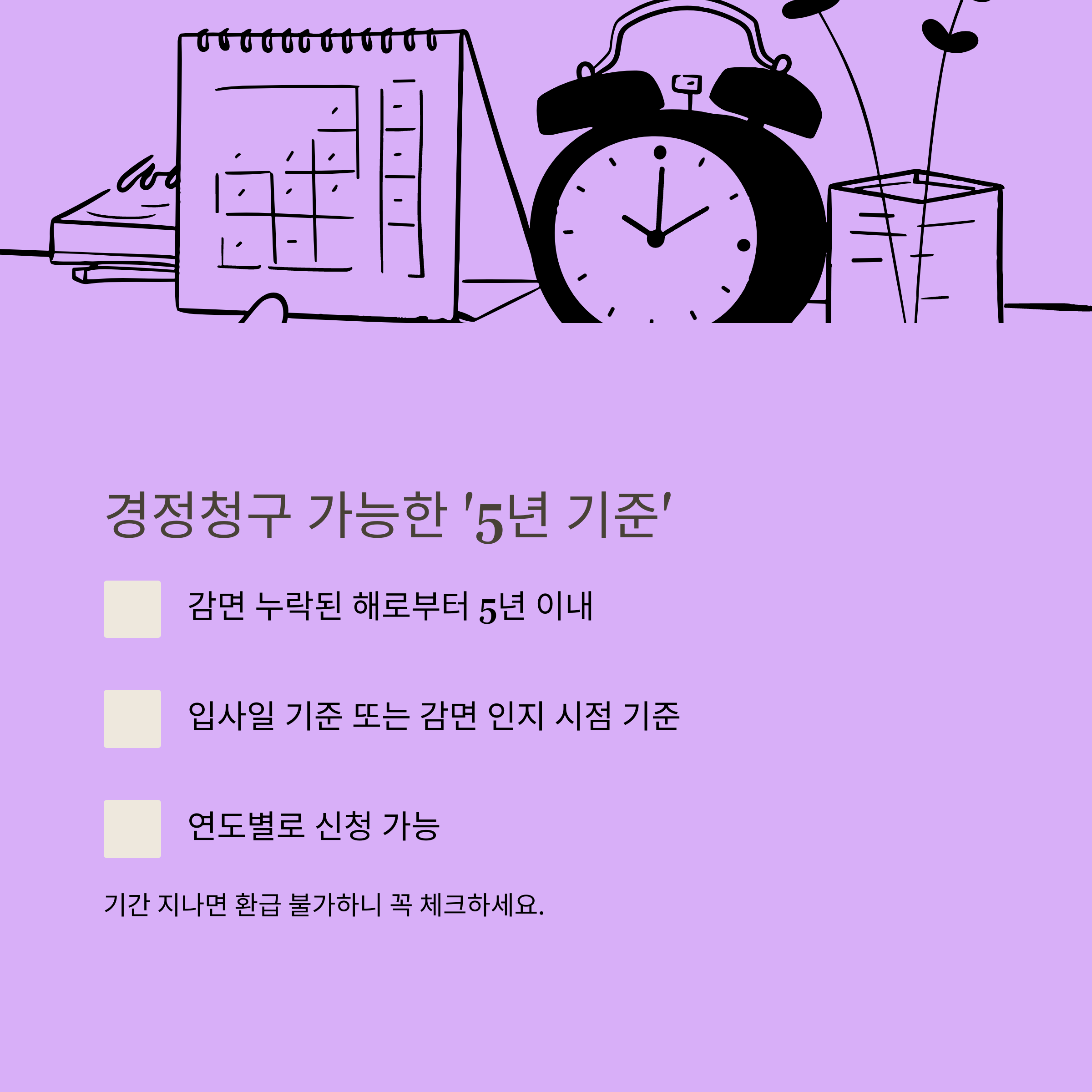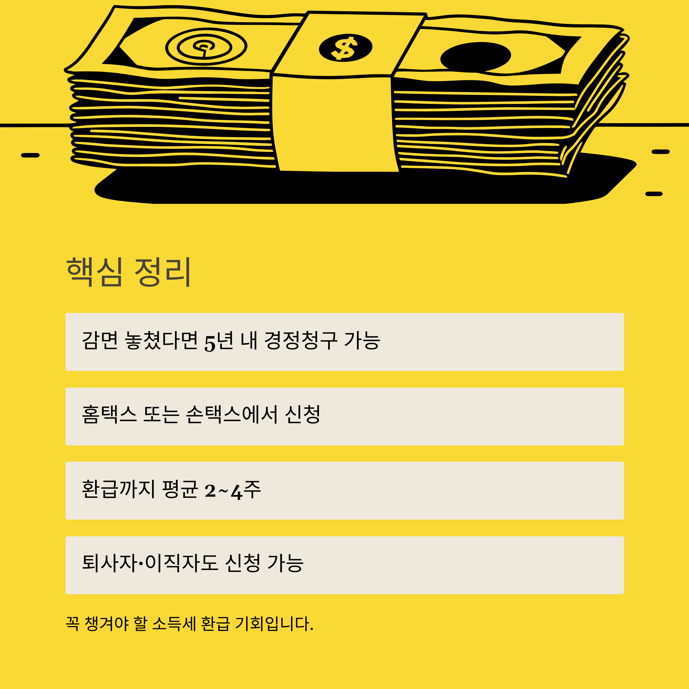 - 경정청구 기간(5년) 반드시 확인: 저는 기간 만료 2달 전에 겨우 환급을 신청해 아찔했던 적이 있습니다.
