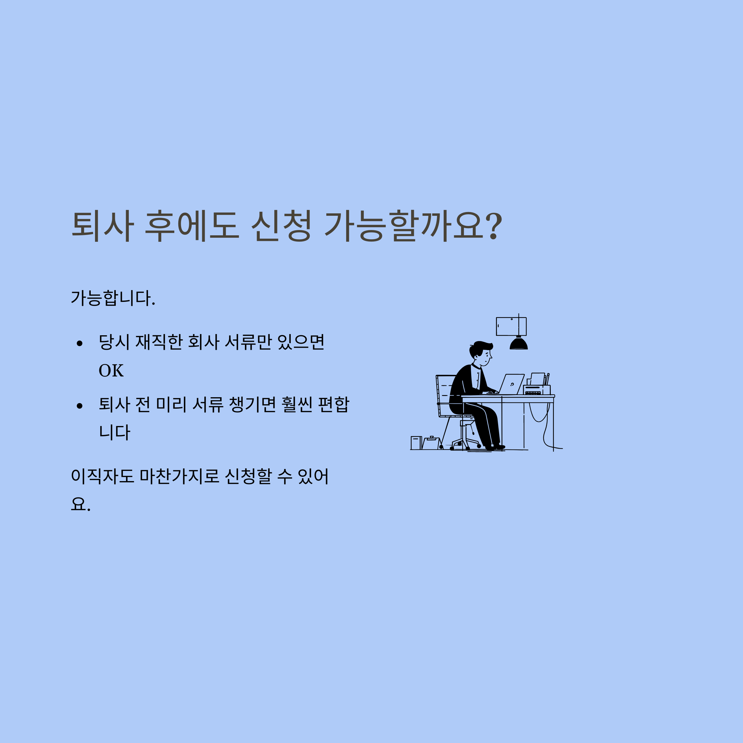 A. 네, 퇴사해도 재직 당시 서류만 있으면 문제없이 신청할 수 있습니다.