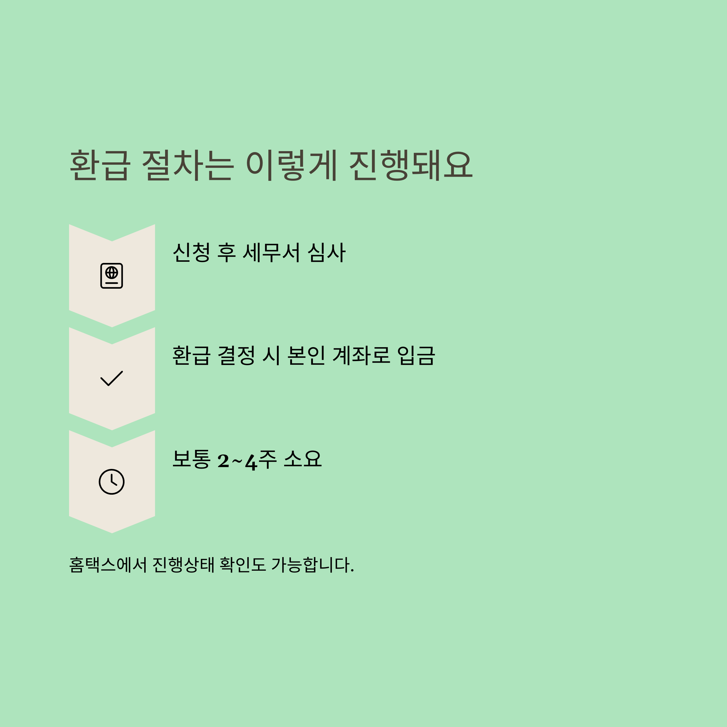 | 환급입금 | 심사 후 2~4주 내 본인 명의 계좌로 입금 |