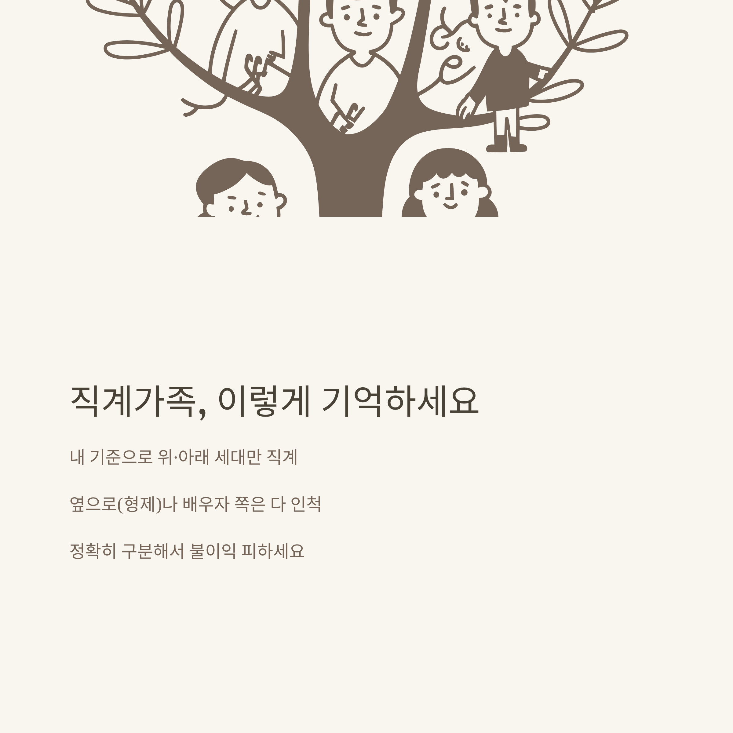 즉, 나를 기준으로 ‘위로 올라가는 가족’과 ‘아래로 내려가는 가족’만 해당되고, 옆으로(형제, 자매, 배우자 등)는 직계가족에 해당되지 않습니다.