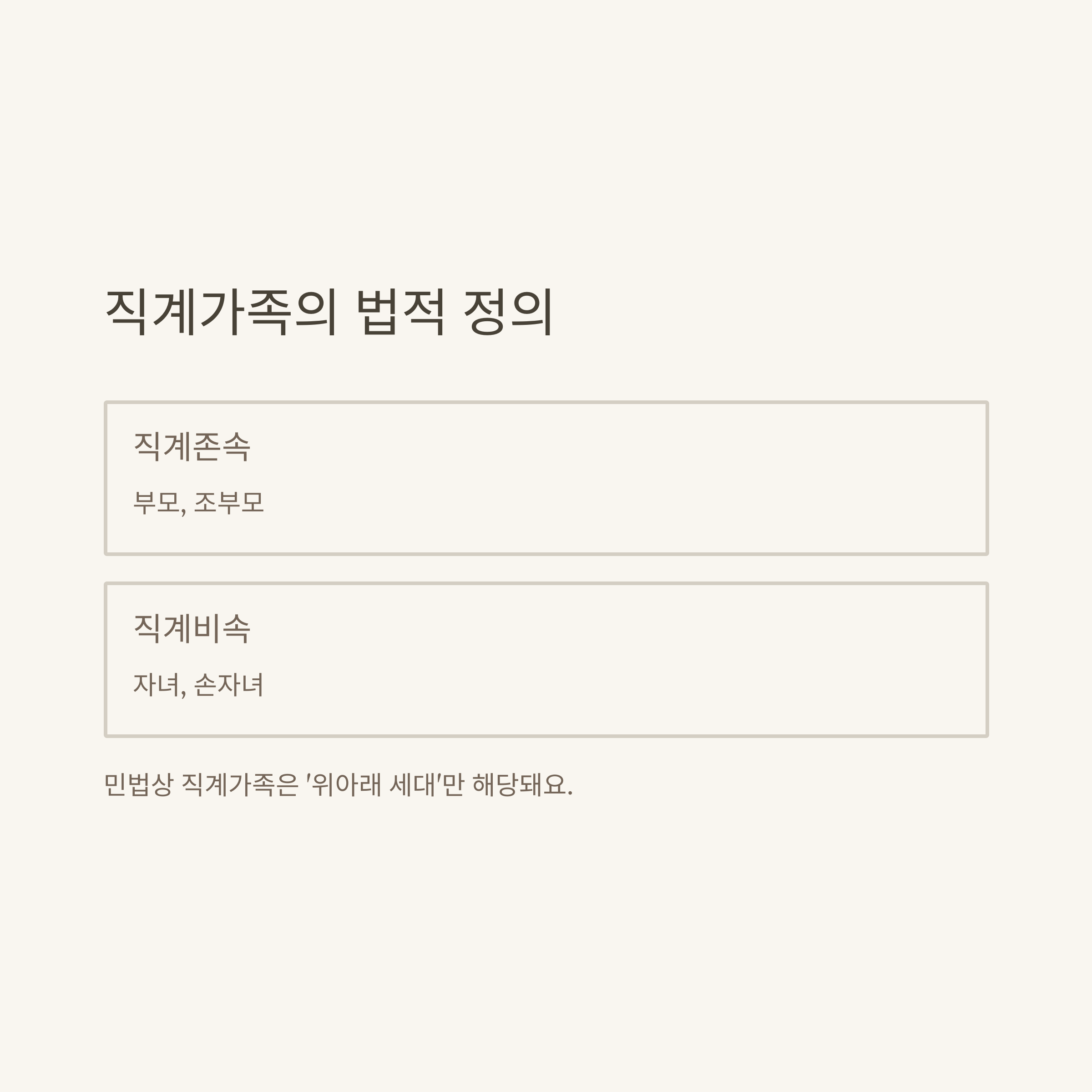| 직계가족 | 본인 기준 직계존속(부모·조부모) + 직계비속(자녀·손자녀) | 민법 |