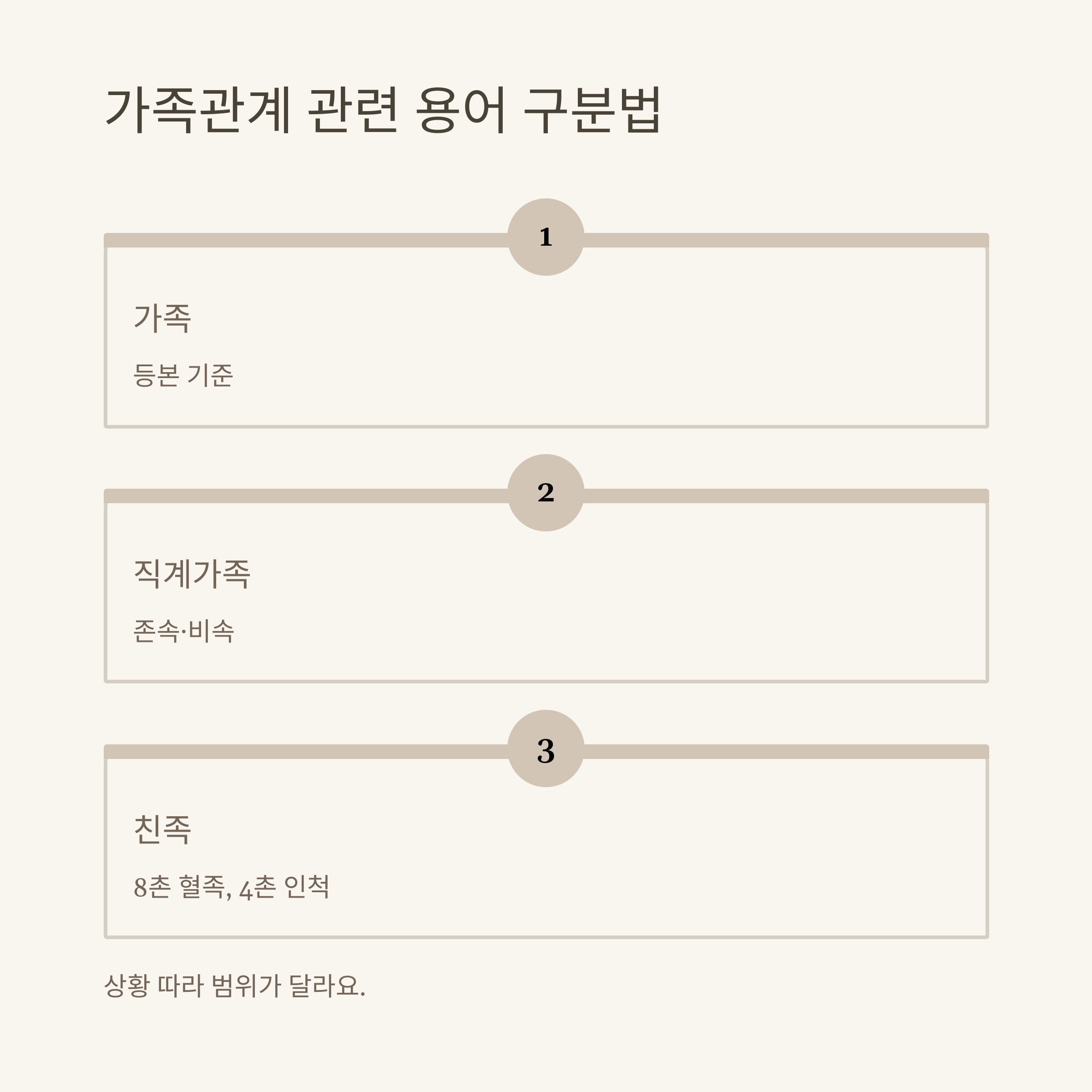 공식 가족관계증명서, 주민등록등본 등에서 실제로 각 용어의 범위가 어떻게 다르게 적용되는지, 필요할 때마다 공식 자료를 반드시 확인하고 넘어가는 것이 실수 없는 팁이었습니다.