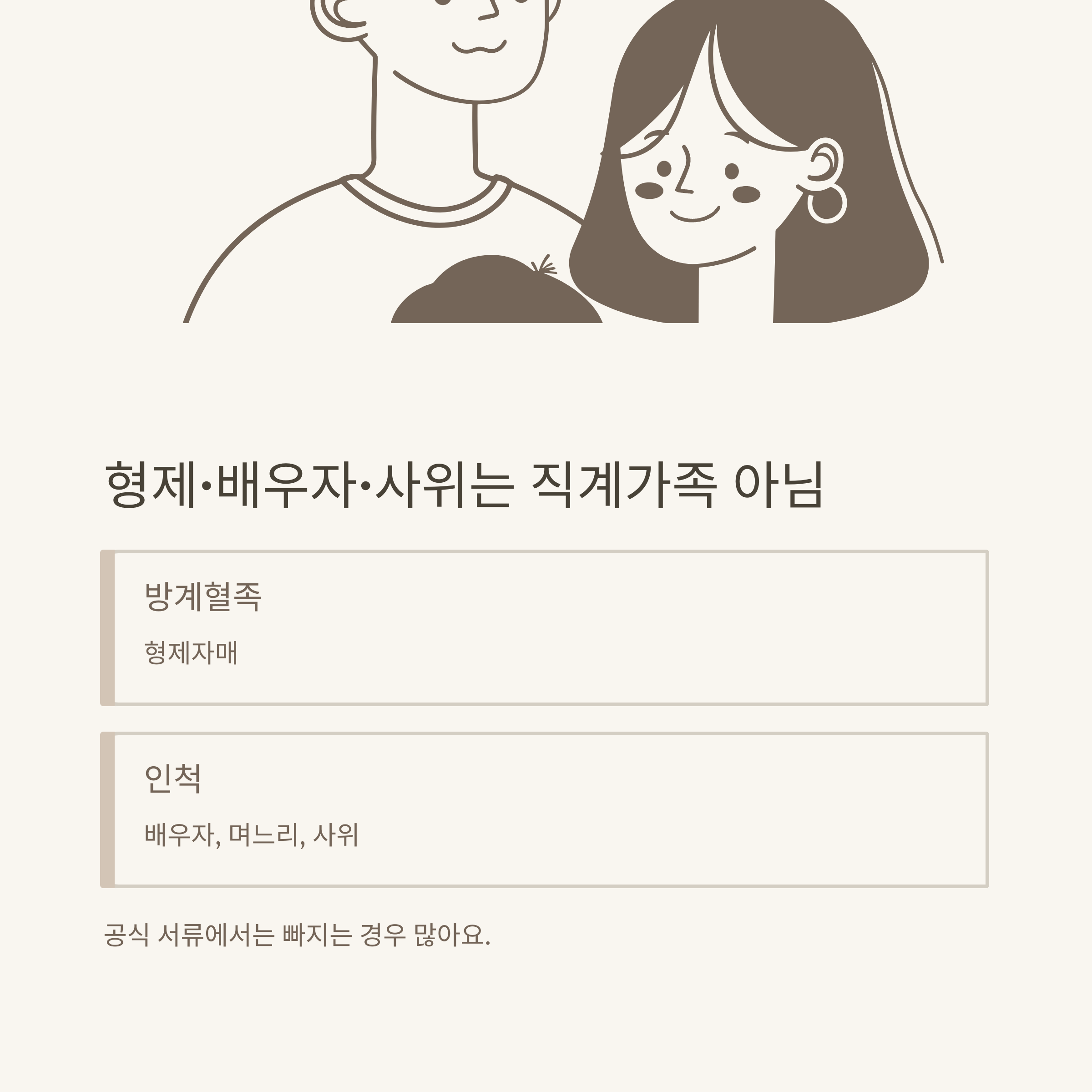 ‘형제도 우리 가족인데, 왜 직계가족이 아니죠?’ 실제로 저도 은행, 보험, 복지 신청할 때 이런 궁금증이 많았습니다. 결론부터 말씀드리면, 형제, 자매, 동생은 법적으로 ‘방계혈족’에 해당되기 때문에 직계가족에 포함되지 않습니다.