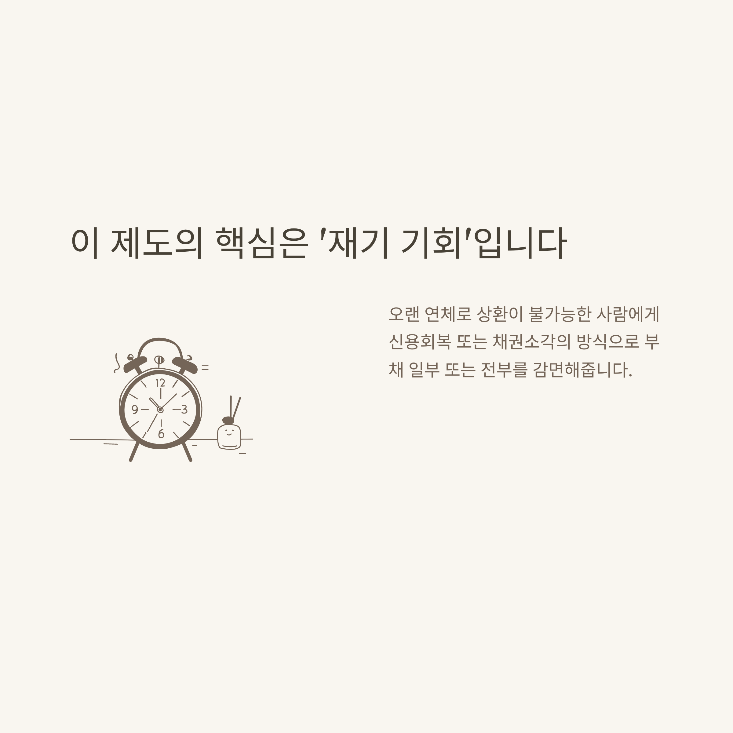 이 제도의 취지는, 7년 이상 연체·상환 불가에 놓인 채무자에게 재기의 기회를 주기 위함입니다. 신용회복위원회, 캠코(한국자산관리공사), 법원 개인회생제도 등 다양한 기관에서 운영 중이고, 각 기관마다 지원 대상과 방법이 조금씩 다르기 때문에 본인의 상황에 꼭 맞는 제도를 찾는 게 핵심입니다.