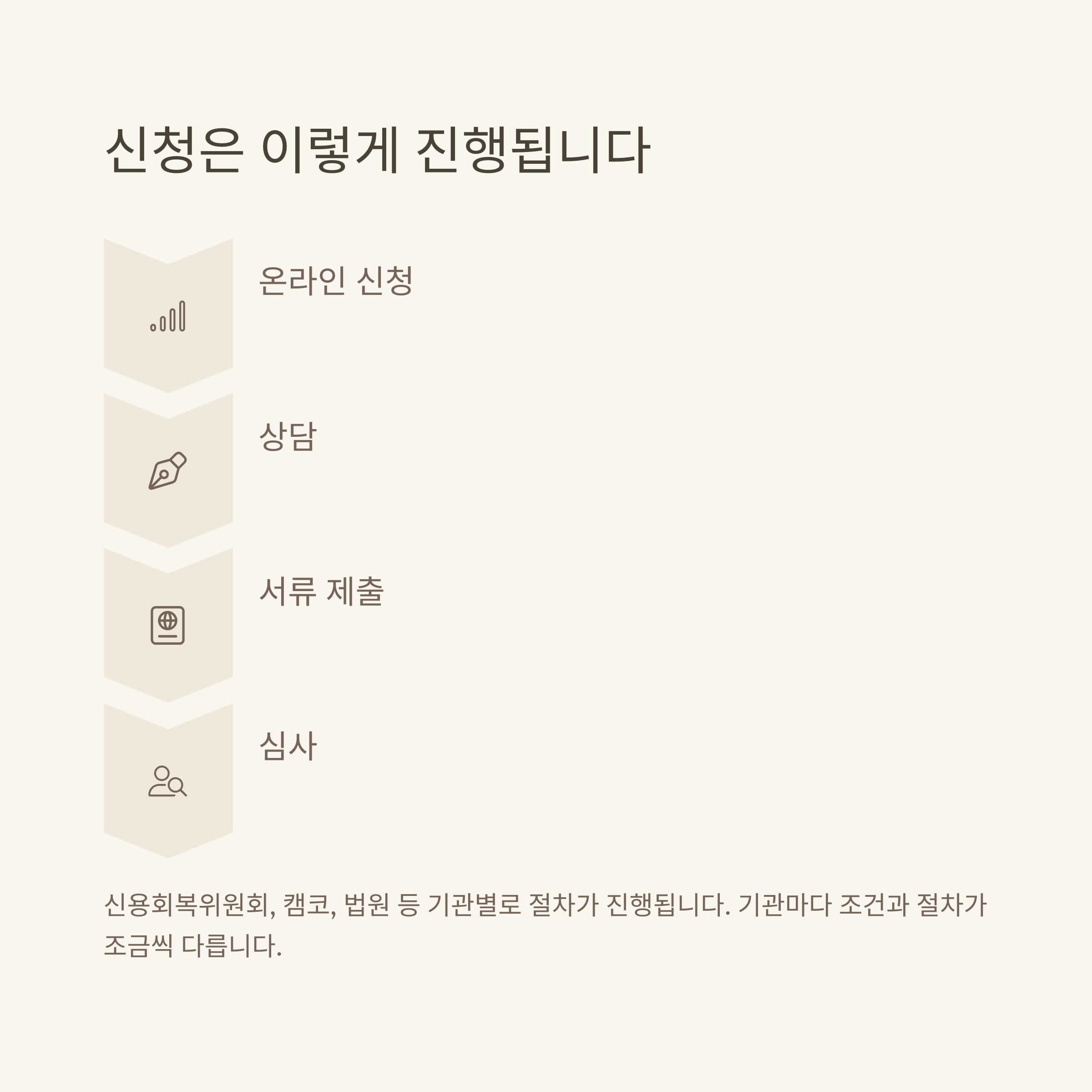 - 신용회복위원회: 온라인(홈페이지) 및 전화 상담 후, 서류 제출 및 채무조정 심사 진행