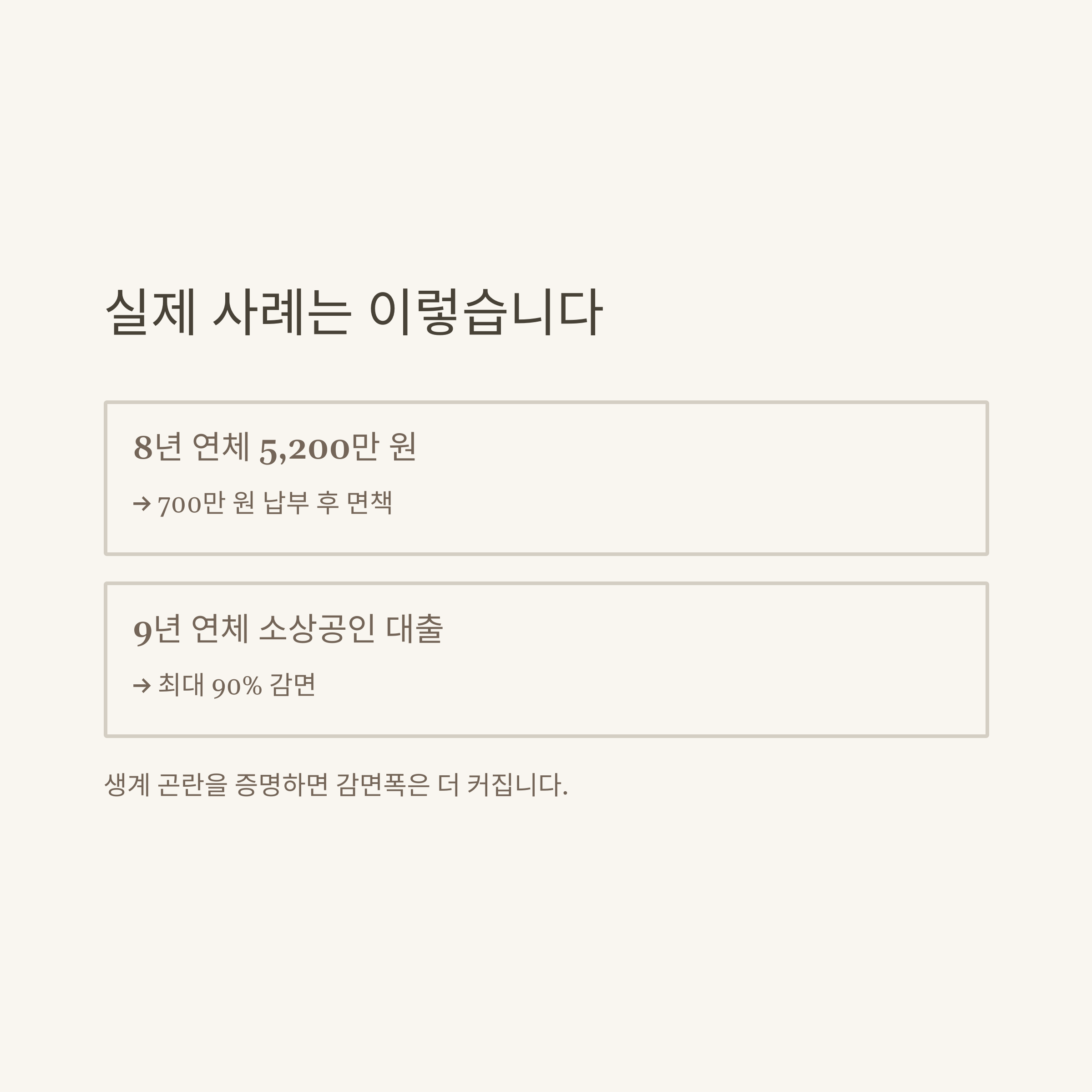 | B씨(부산, 35세) | 9년 연체 소상공인 대출, 캠코 채권 매입 | 최대 90% 감면, 생계형 채무자 지원 |