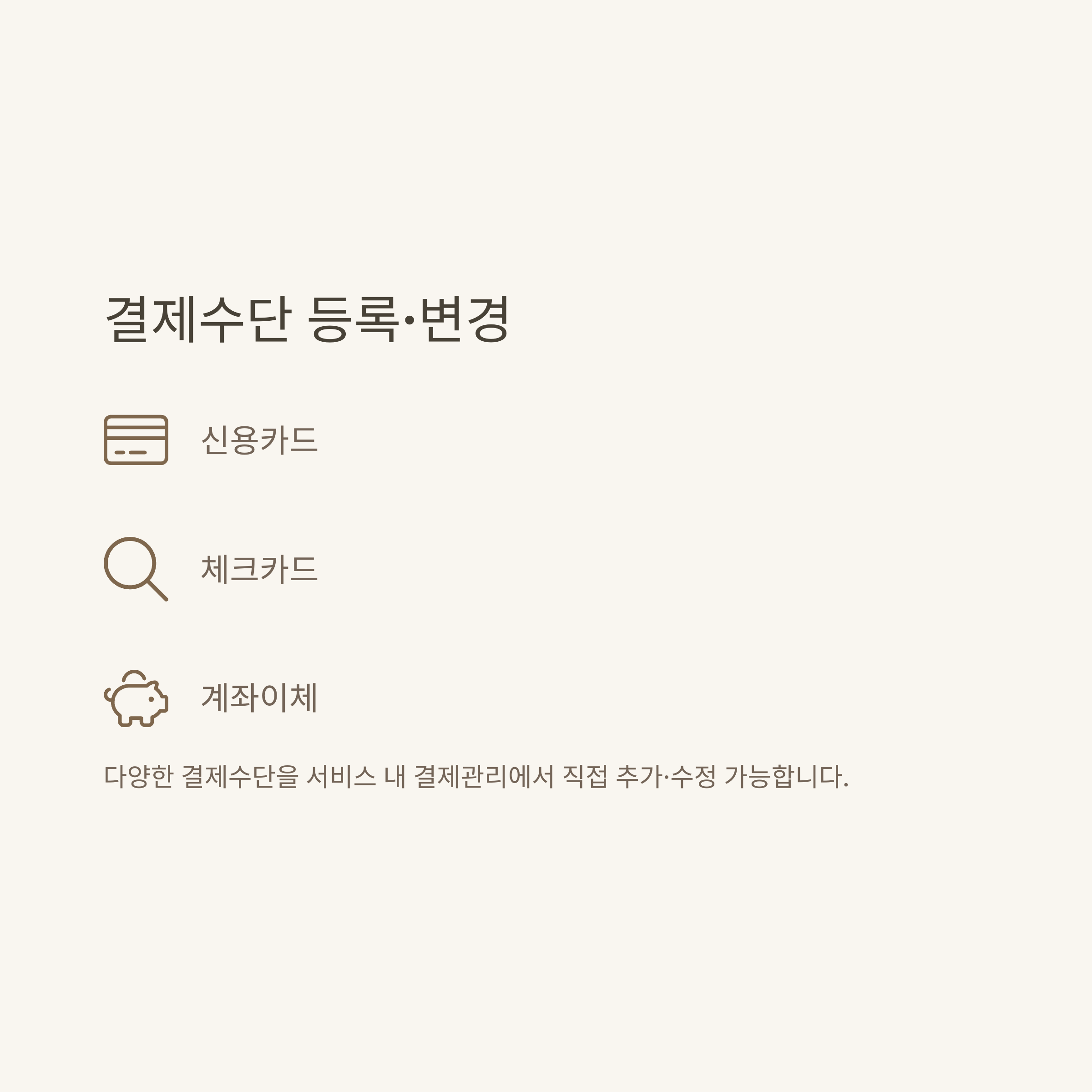 - 서비스·앱 내 ‘결제관리’에서 결제수단 직접 추가/변경